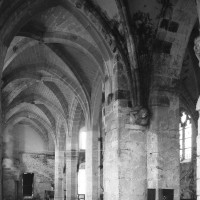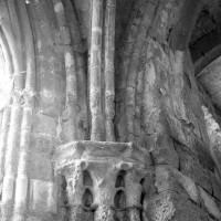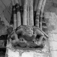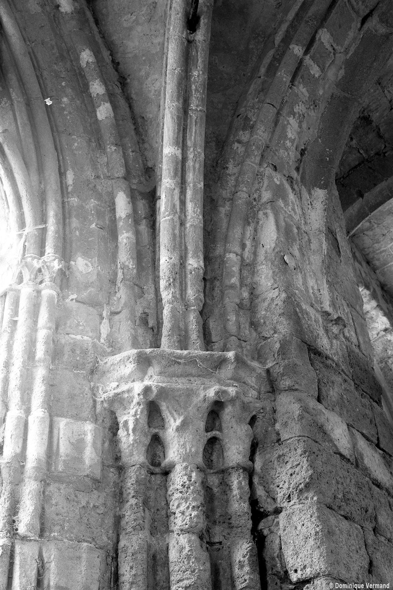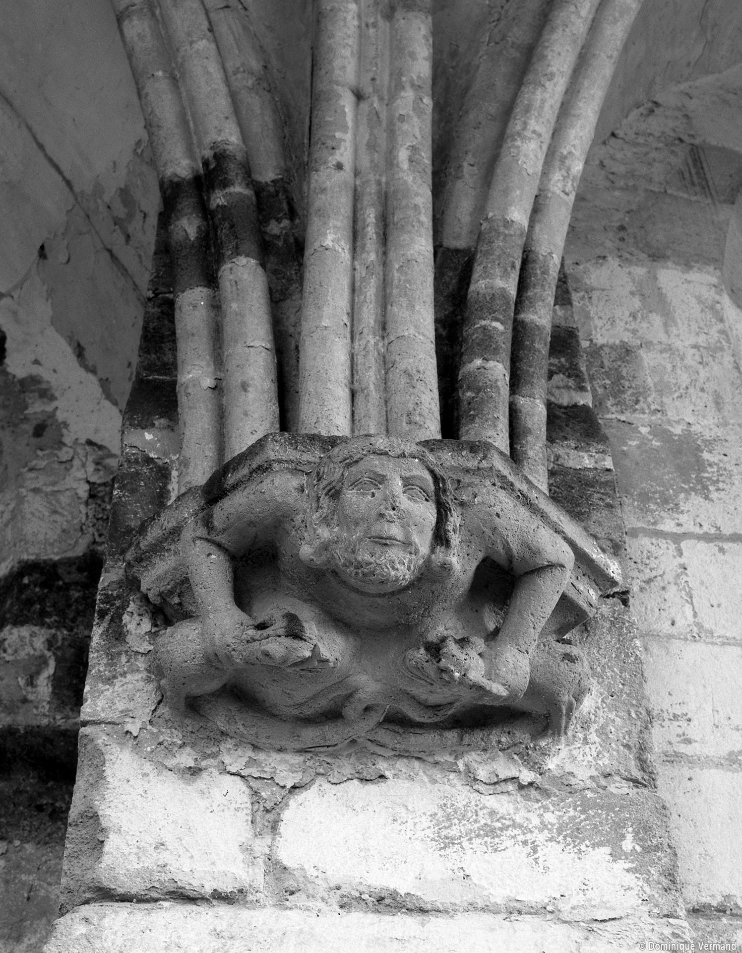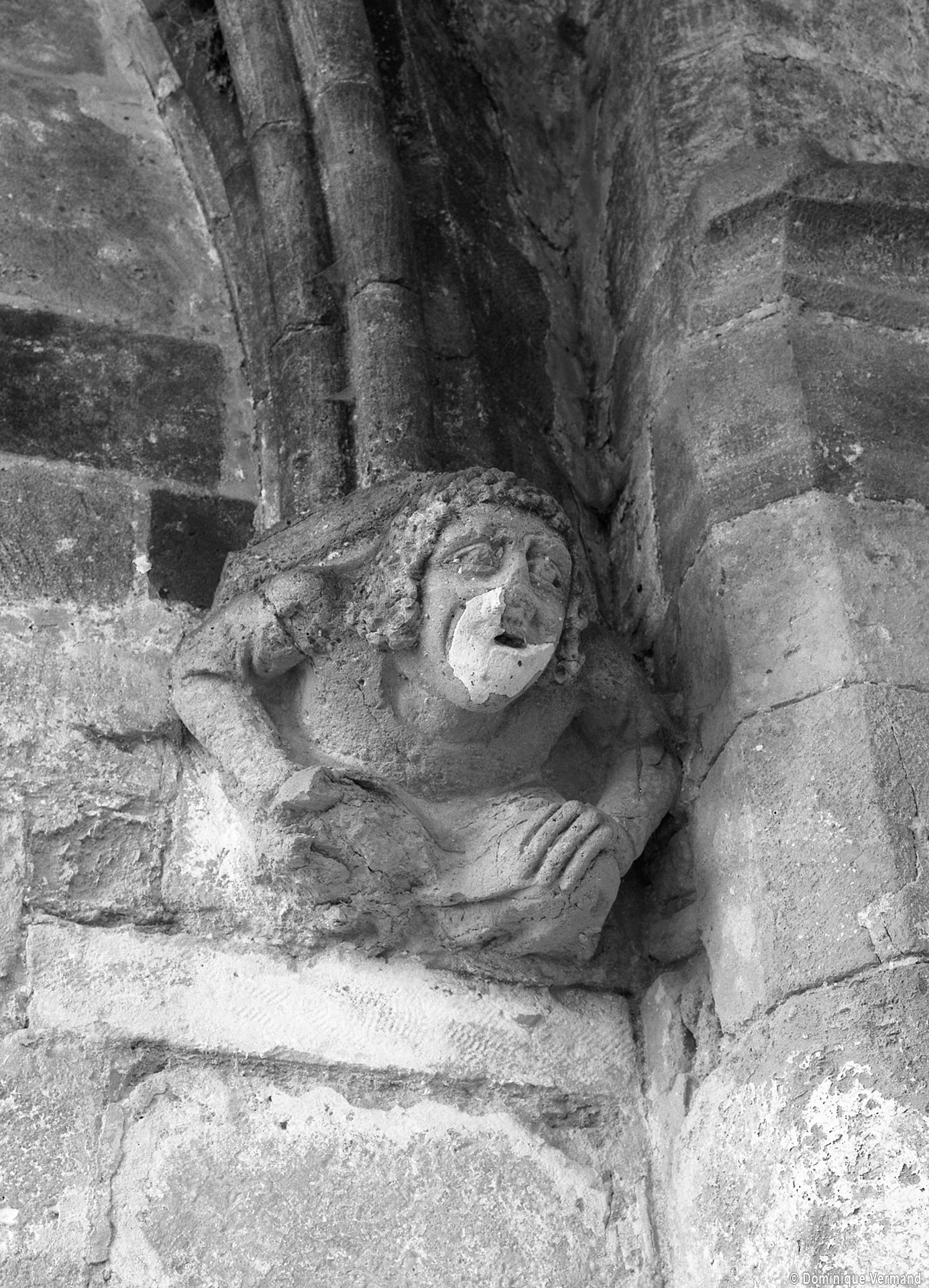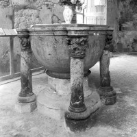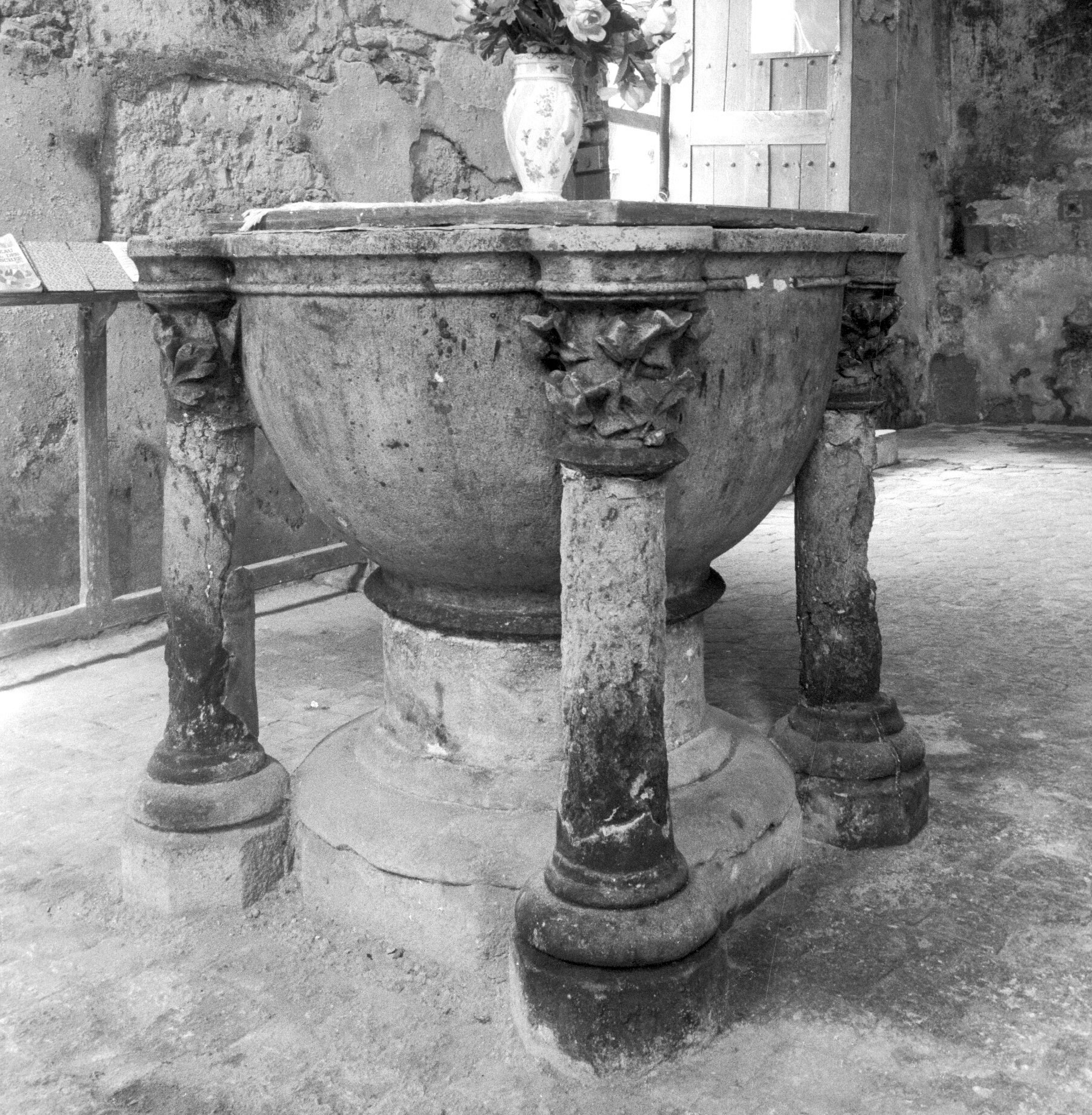 La magnifique cuve baptismale à gros fût circulaire flanqué de quatre colonnettes, du 14ème siècle, est malheureusement rongée par l’humidité et mériterait un meilleur sort (1996, modifié 2016).