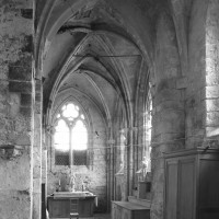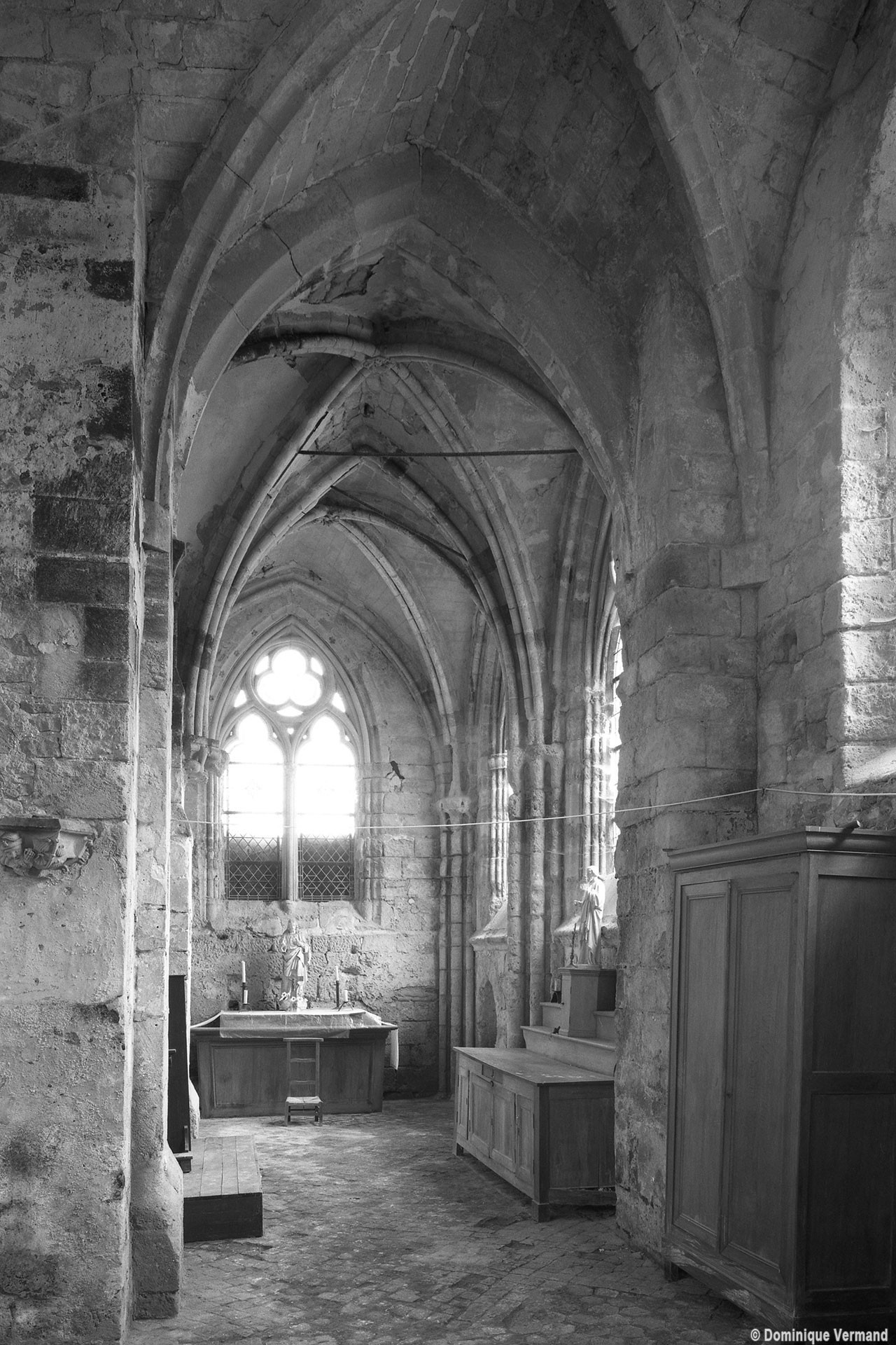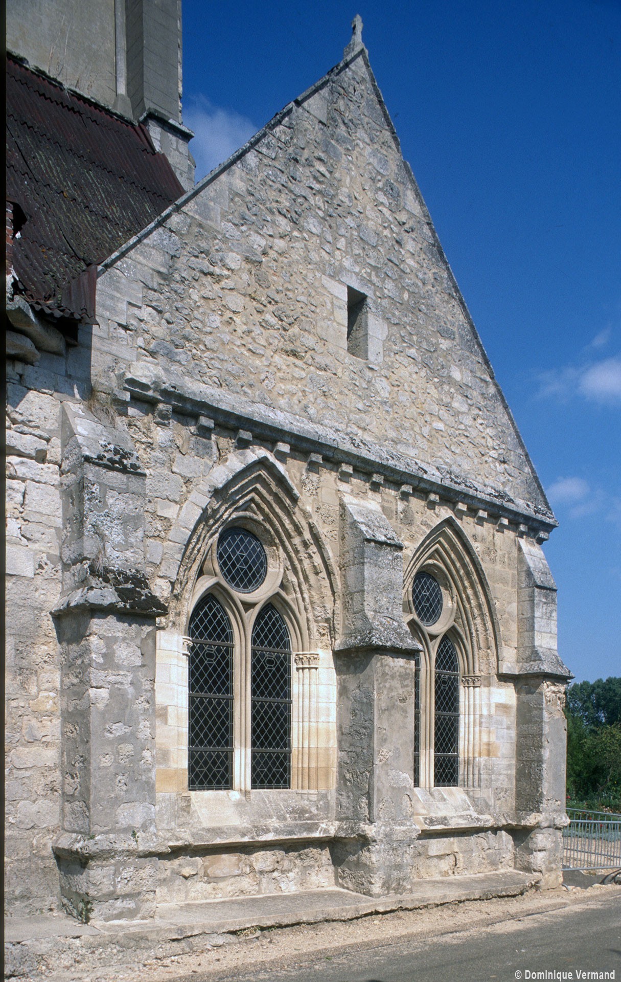 C’est durant la seconde moitié du 13ème siècle qu’une chapelle de deux travées est construite au sud du chœur. Un bas-côté est adjoint à la nef peu après. La chapelle, parfait exemple du style rayonnant, est d’un très grand raffinement. Formerets, ogives et doubleau sont reçus au sud sur des faisceaux de colonnettes par l’intermédiaire de chapiteaux malheureusement dégradés. Au nord, contre les maçonneries plus anciennes du chœur, ce rôle est dévolu à des culs-de-lampe dont l’un est sculpté d’une cariatide tenant deux lézards. Le remplage des fenêtres est remarquable par la multiplication des fines colonnettes en relation avec un réseau traité sur différents plans. Bien que partiellement restauré, le tracé du réseau de la fenêtre qui s’ouvre à l’est se retrouve, presque identique, au choeur de la cathédrale de Meaux et pourrait inciter à attribuer cette élégante réalisation à Gauthier de Varinfroy, auteur de ce chef d’oeuvre de l’architecture rayonnante durant le troisième quart du 13ème siècle.
