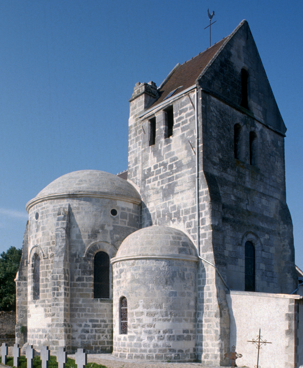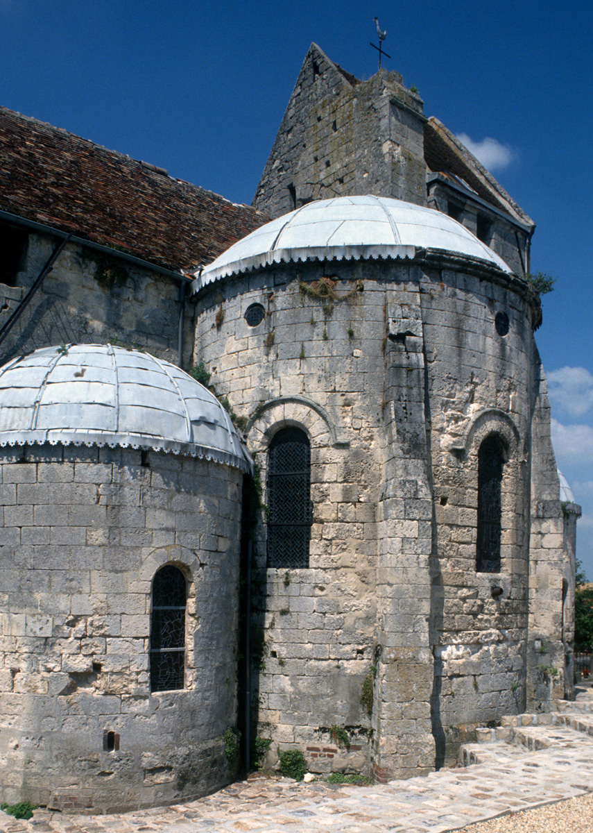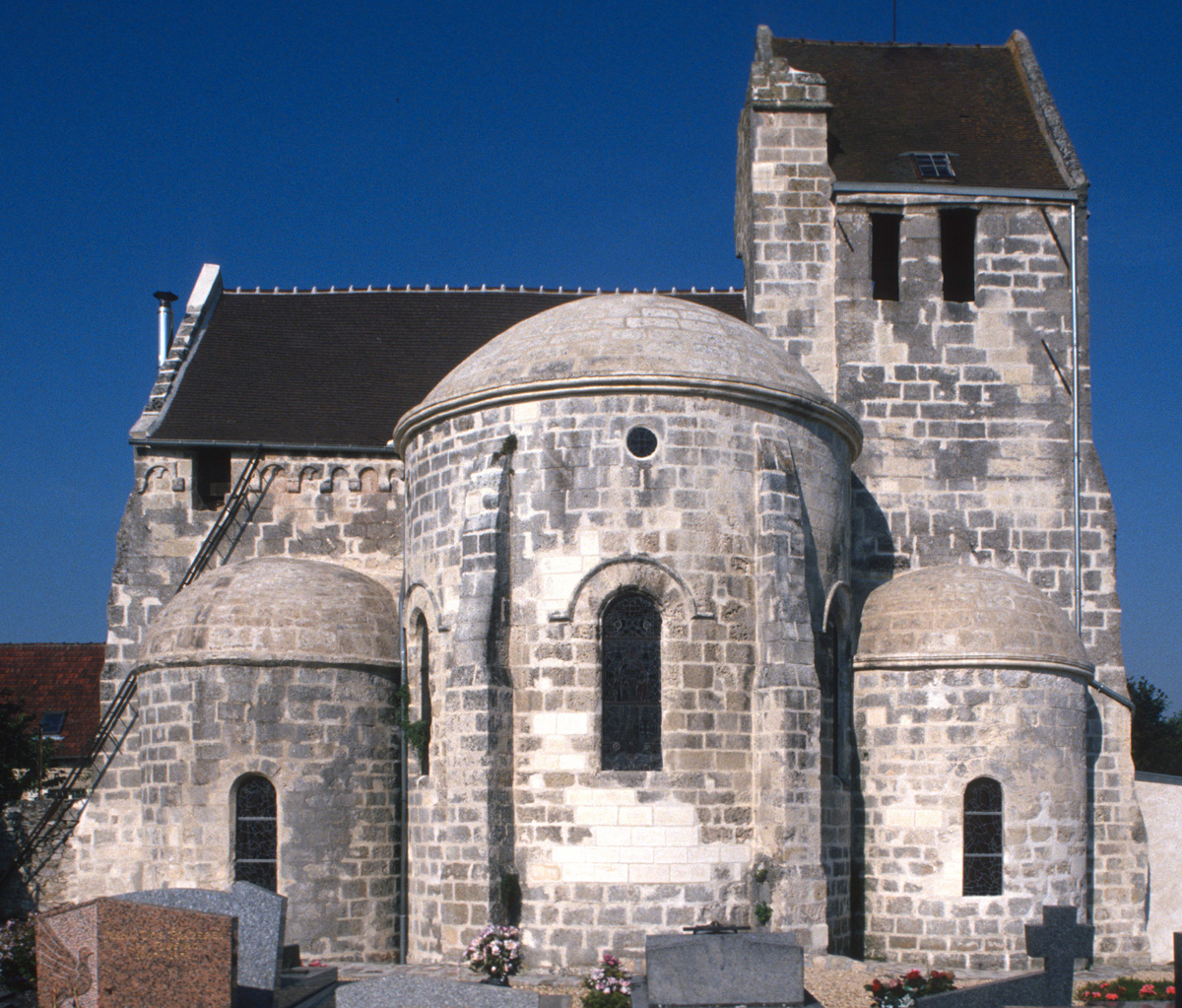 Au roman, l’église doit le plan de son chevet qui, associant abside et absidioles en hémicycle, reprend une disposition fréquente dans nombre d’édifices du 11ème siècle, à commencer par Morienval dans son premier état et qu’on retrouve intacte à Saint-Léger-aux-Bois et, dans les années 1140, à Chelles. Elle lui doit aussi la voûte d’arêtes de son croisillon nord – celle du sud a été remplacée par une voûte d’ogives au 16ème siècle – et l’association berceau brisé/cul-de-four des absidioles.