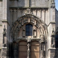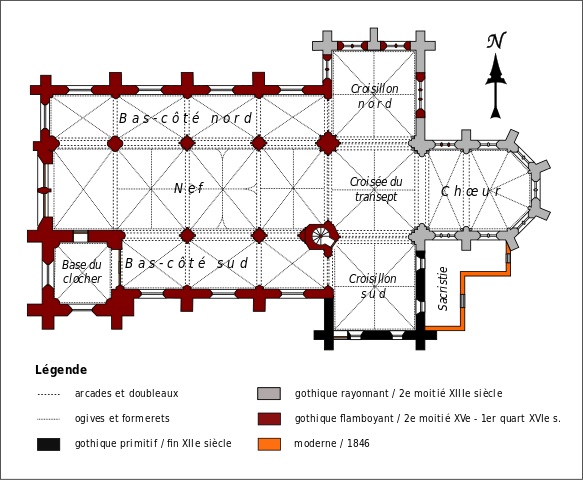 Saint-Pierre était primitivement, et sous le nom de Saint-Pierre-Saint-Paul, la chapelle du palais. La partie la plus ancienne (fin du 12ème siècle) est le bras sud du transept, beaucoup plus élevé que le reste de l’église et connu autrefois sous le nom de chapelle Charlemagne.