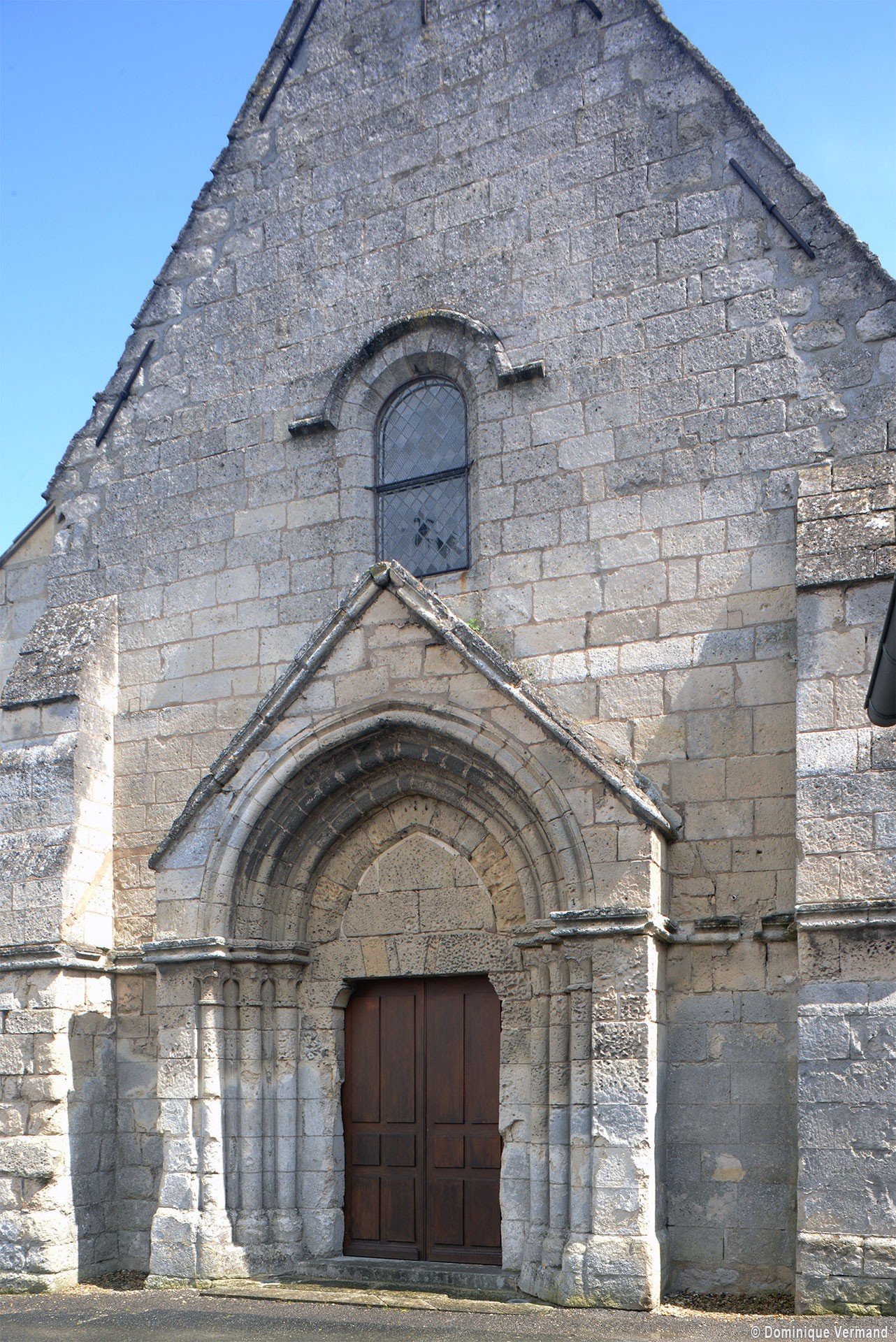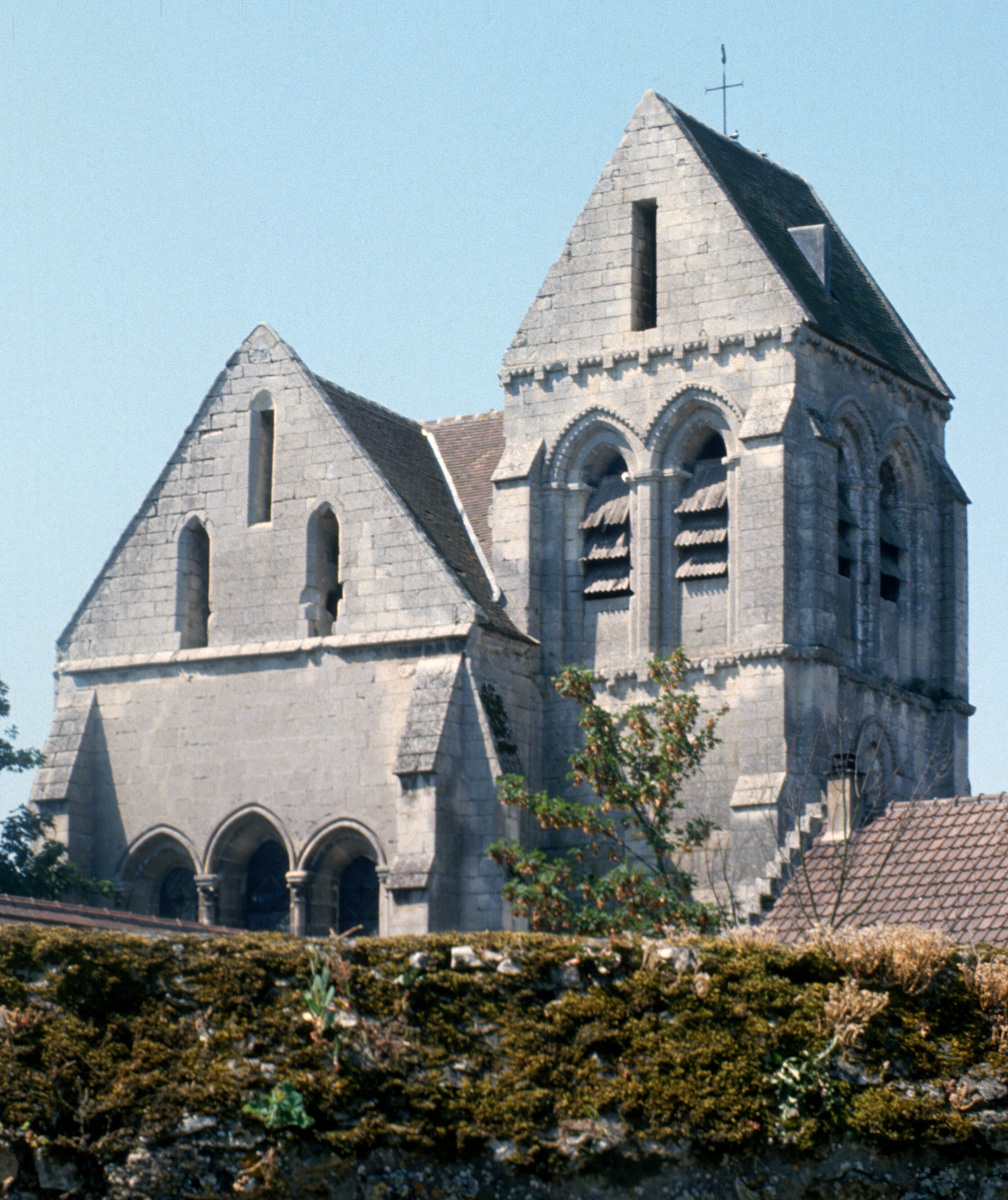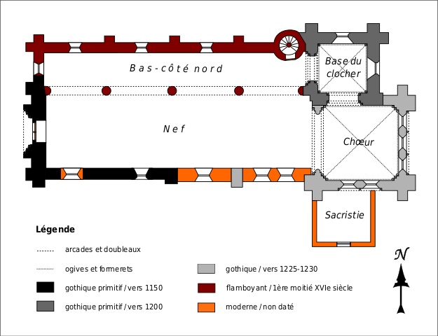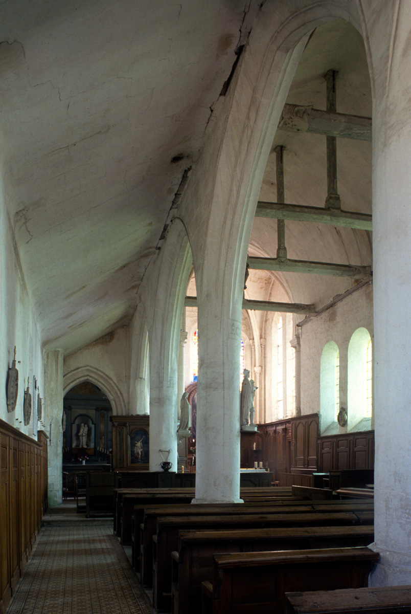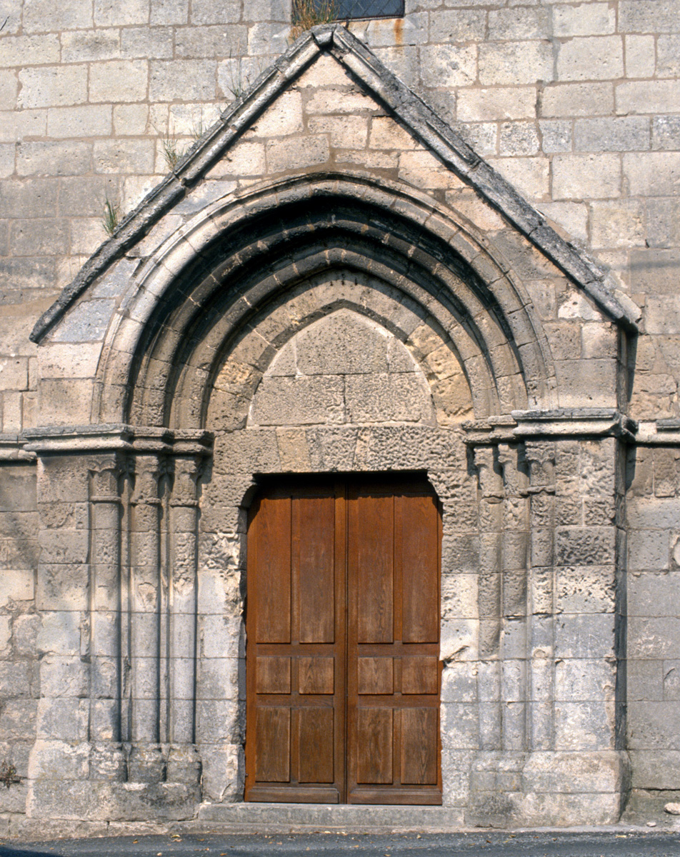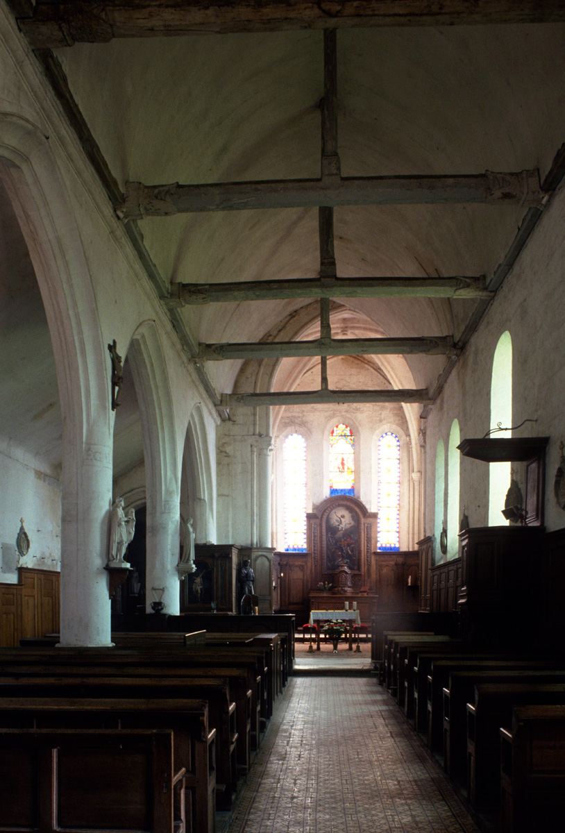 La partie la plus ancienne est la longue nef, bâtie vers 1150 et dont ne s’est guère conservée intacte que la façade. Au centre de celle-ci s’ouvre un beau portail à gâble orné de trois rangées de colonnettes. Le mur sud, trop remanié, n’a plus de caractère et le mur nord a été repris en sous-oeuvre au 16ème siècle lorsque l’église fut dotée d’un bas-côté.