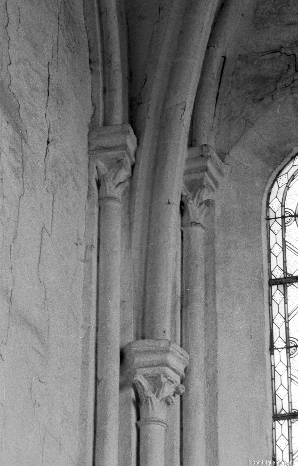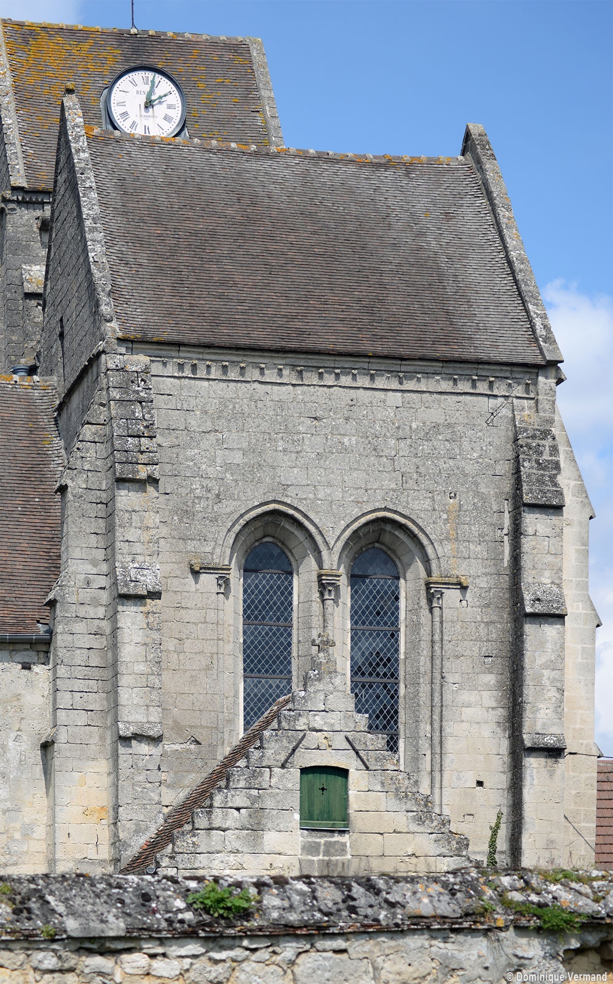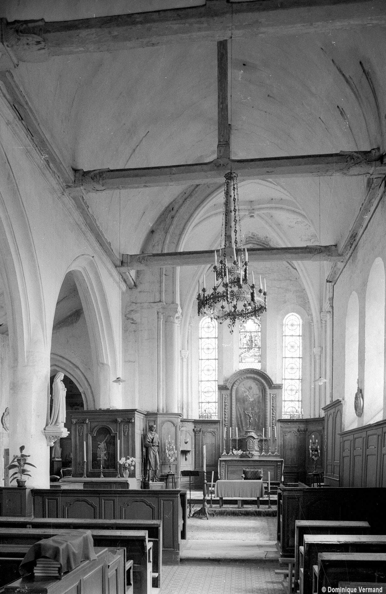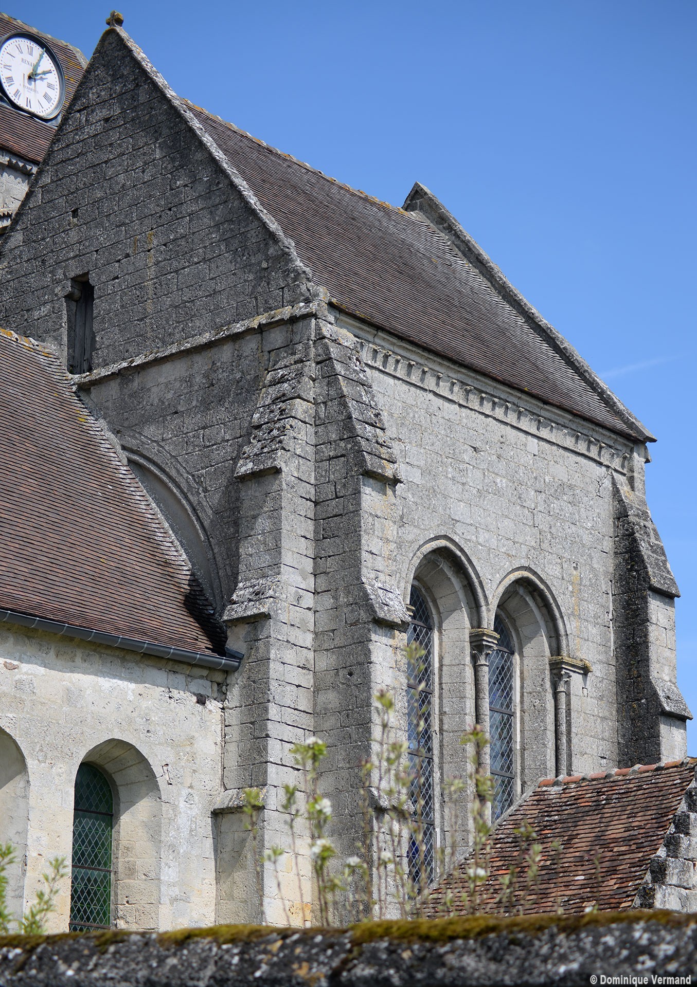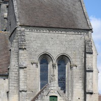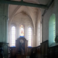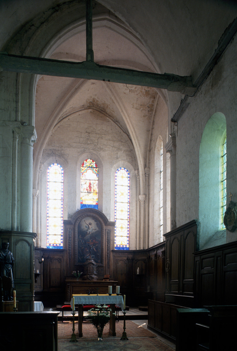 Bâti vers 1225/30, le choeur est une remarquable construction, très élevée par rapport à la nef. Son unique travée se termine par un chevet plat dans lequel s’ouvre un triplet. Arcs formerets et ogives retombent sur de minces colonnettes par l’intermédiaire de chapiteaux à crochets. A l’extérieur, l’archivolte des fenêtres – deux s’ouvrent également au sud – est adoucie par un tore et des colonnettes en délit garnissent les piédroits, un choix esthétique qui concours à l’impression de sobriété raffinée qui se dégage de cette partie de l’édifice.