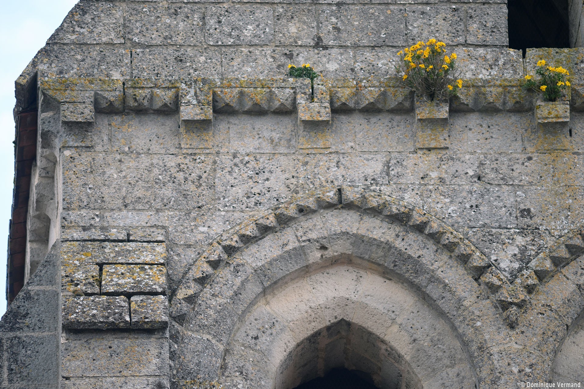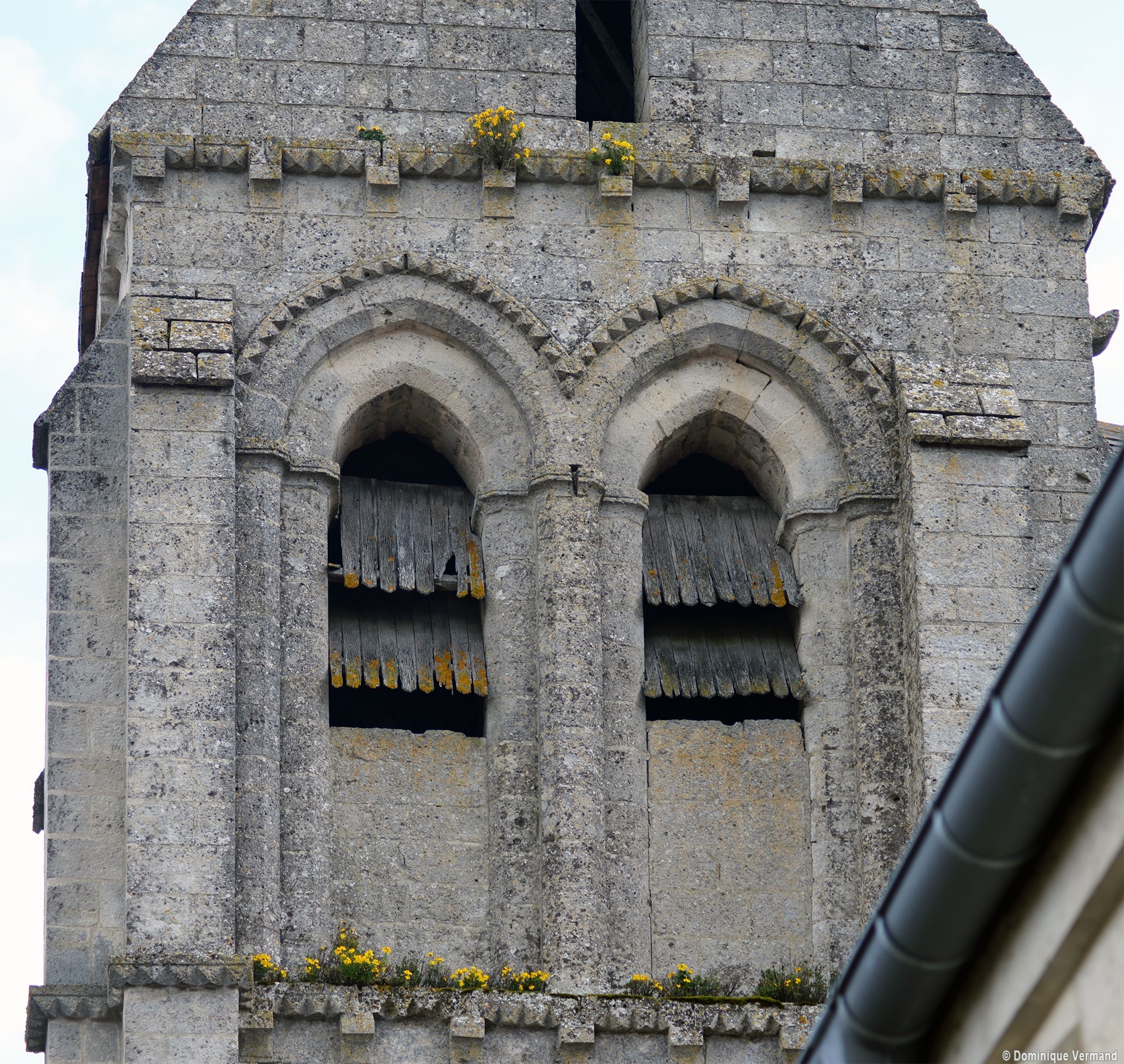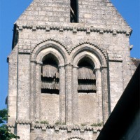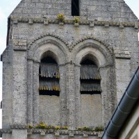 C’est dans un second temps – vers 1200 – qu’est construit, au nord du choeur qui a précédé l’actuel, le clocher. C’est une tour assez austère dont l’étage du beffroi est ajouré de deux baies en arc brisé sur chaque face. Un cordon de pointes de diamant sépare les deux étages, contourne l’archivolte des baies et se retrouve également à la corniche. Une tour pratiquement identique et oeuvre, sans doute, du même atelier, se retrouve à Pondron.