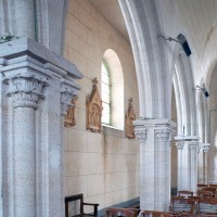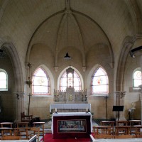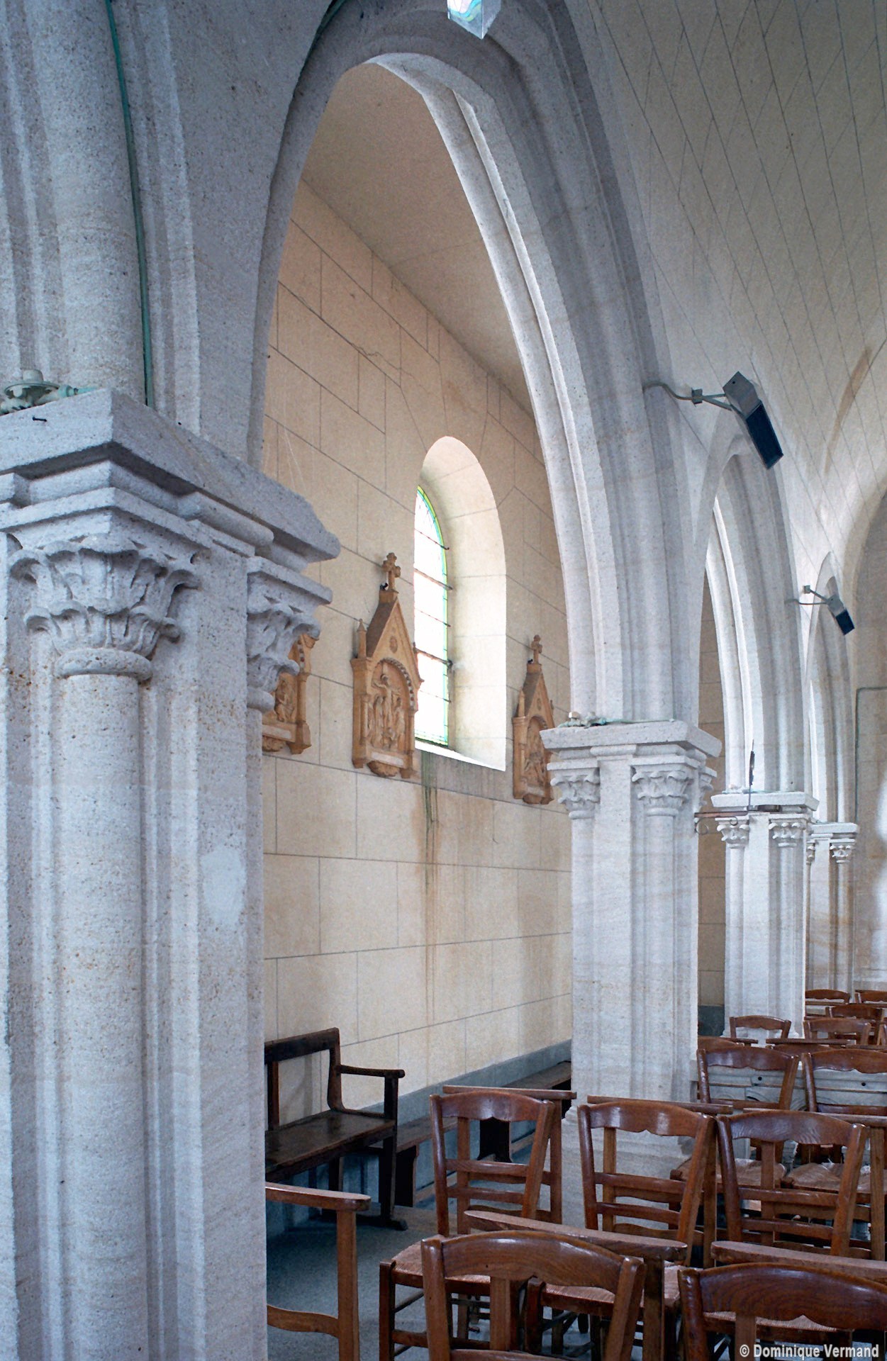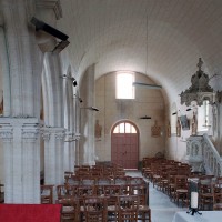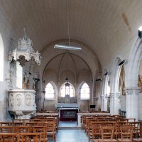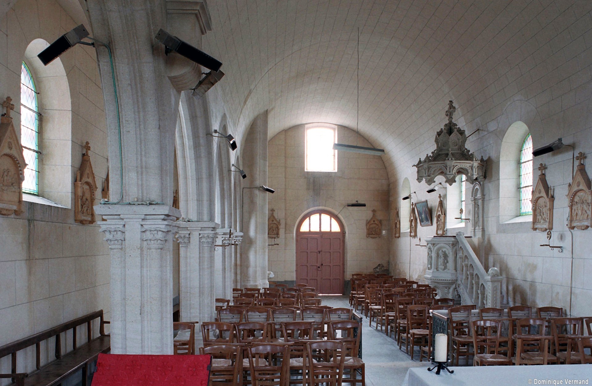 Très hétérogène et reconstruite en s’inspirant de l’ancien édifice, son analyse est difficile. Il semble que les trois arcades de la nef et celles du transept perpétuent le souvenir d’un édifice de la fin du 12ème siècle, profondément modifié par la suite. L’abside et les croisillons, ces derniers couverts de curieuses coupoles oblongues, devaient être des 16ème et 19ème siècles. Le clocher est, finalement, le seul élément bien caractérisé et avait été bâti au 17ème siècle. Implanté en façade, au sud de la nef, c’est une tour massive, épaulée par de puissants contreforts – l’angle sud-ouest contient une tourelle d’escalier – et ajouré de deux petites baies en plein cintre sur chaque face.
