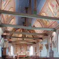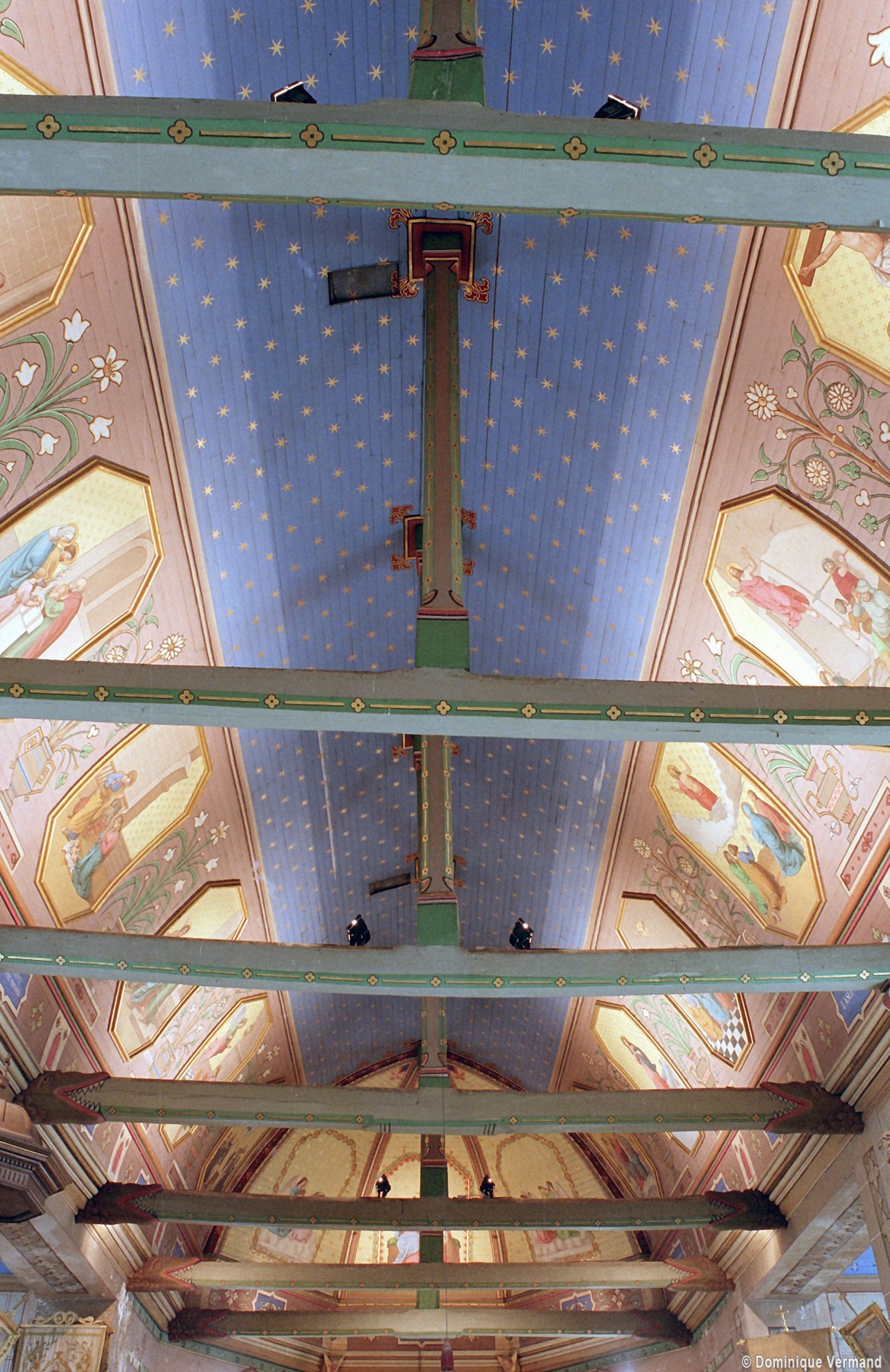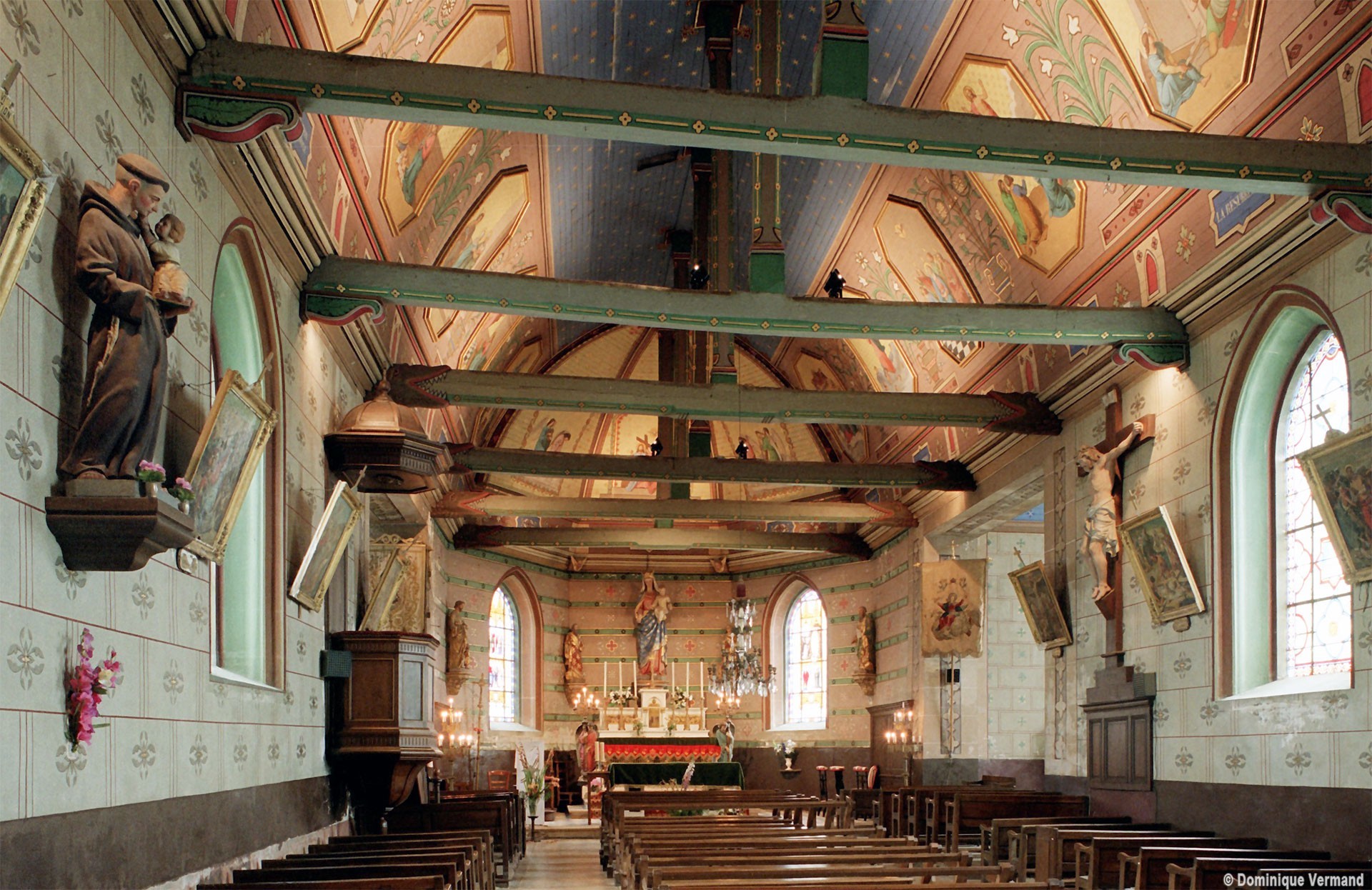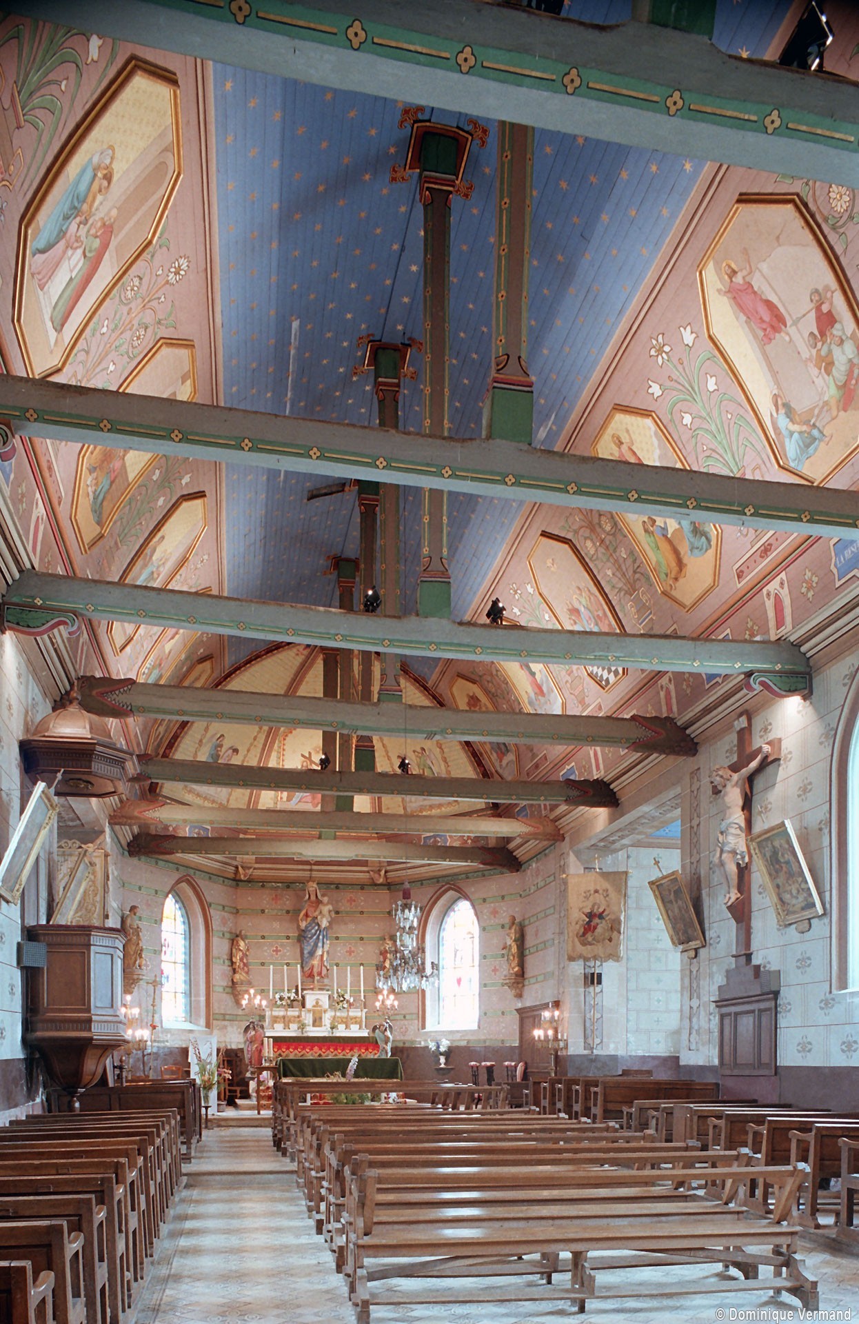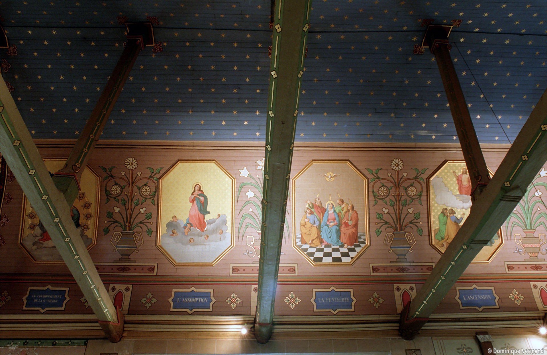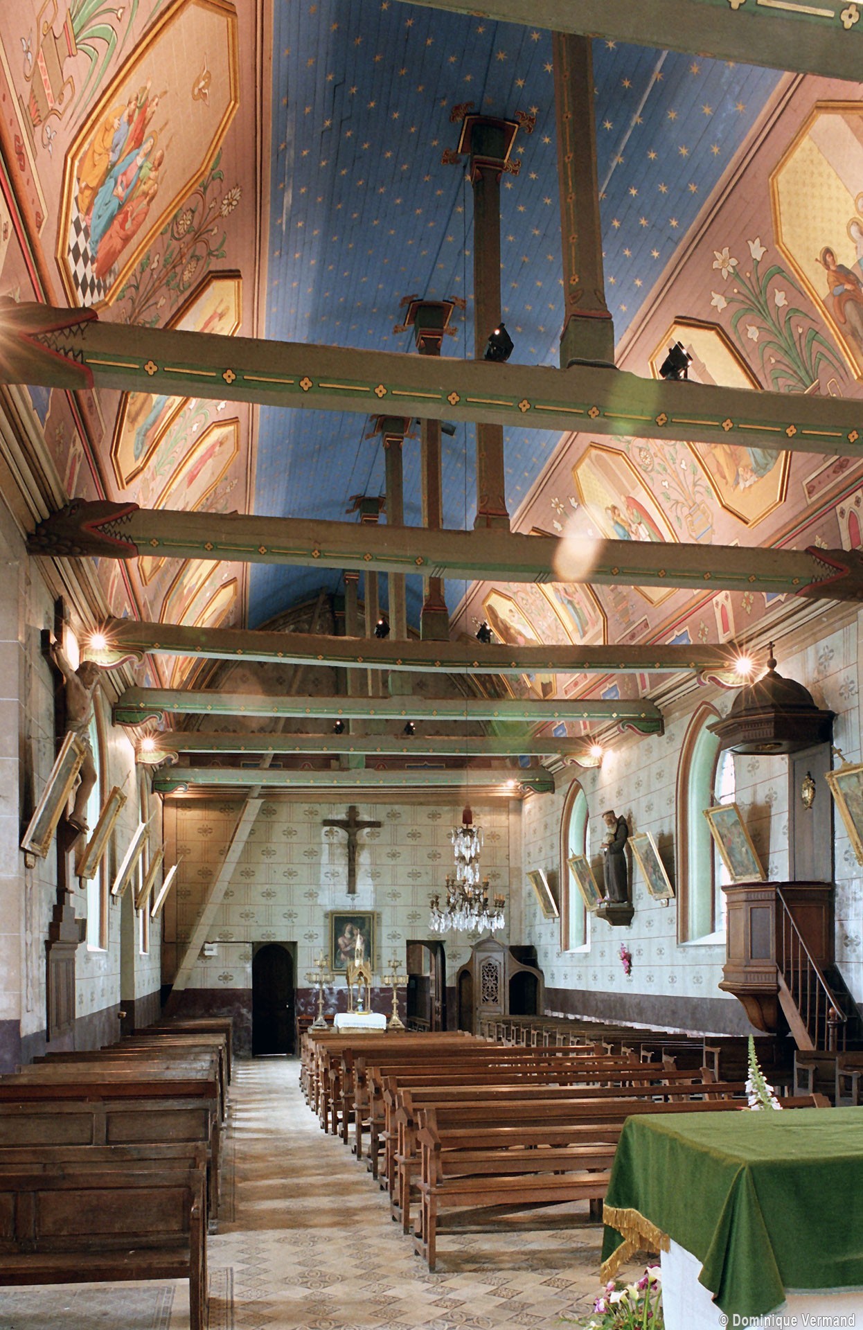 Entièrement refait au 19ème siècle, le décor peint de l’église est tout à fait remarquable, tout particulièrement à la charpente de la nef, où ont été représentés, par le frère Arthème, de l’Institut agricole de Beauvais, des épisodes de la Vie du Christ et des mystères du Rosaire dans un style qui rappelle les enluminures du Moyen Age. Il se complète de six vitraux de Roussel (1878) sur des thèmes divers.