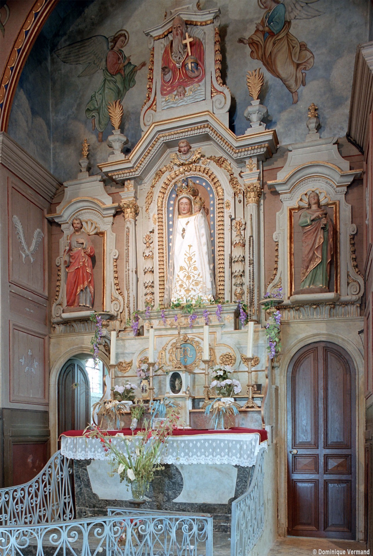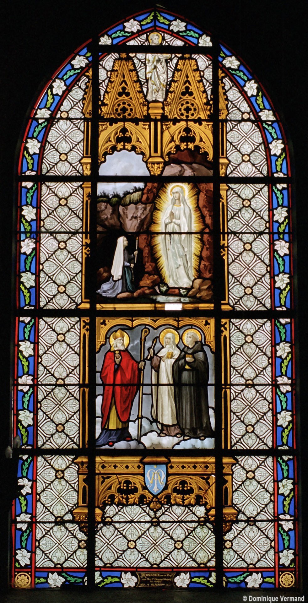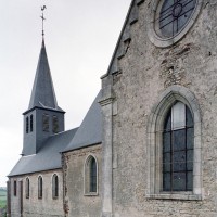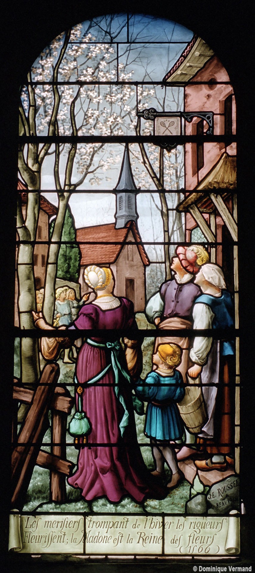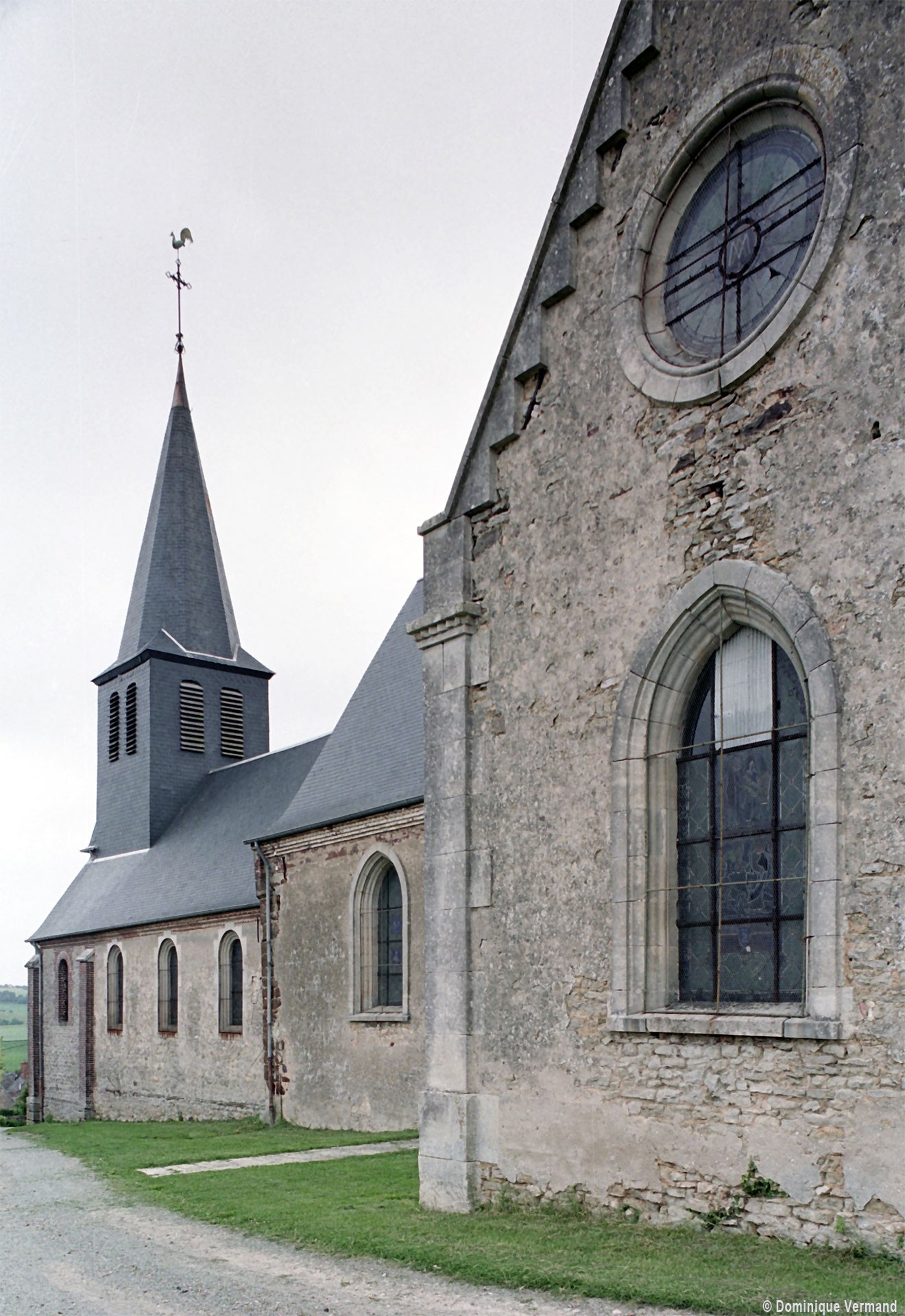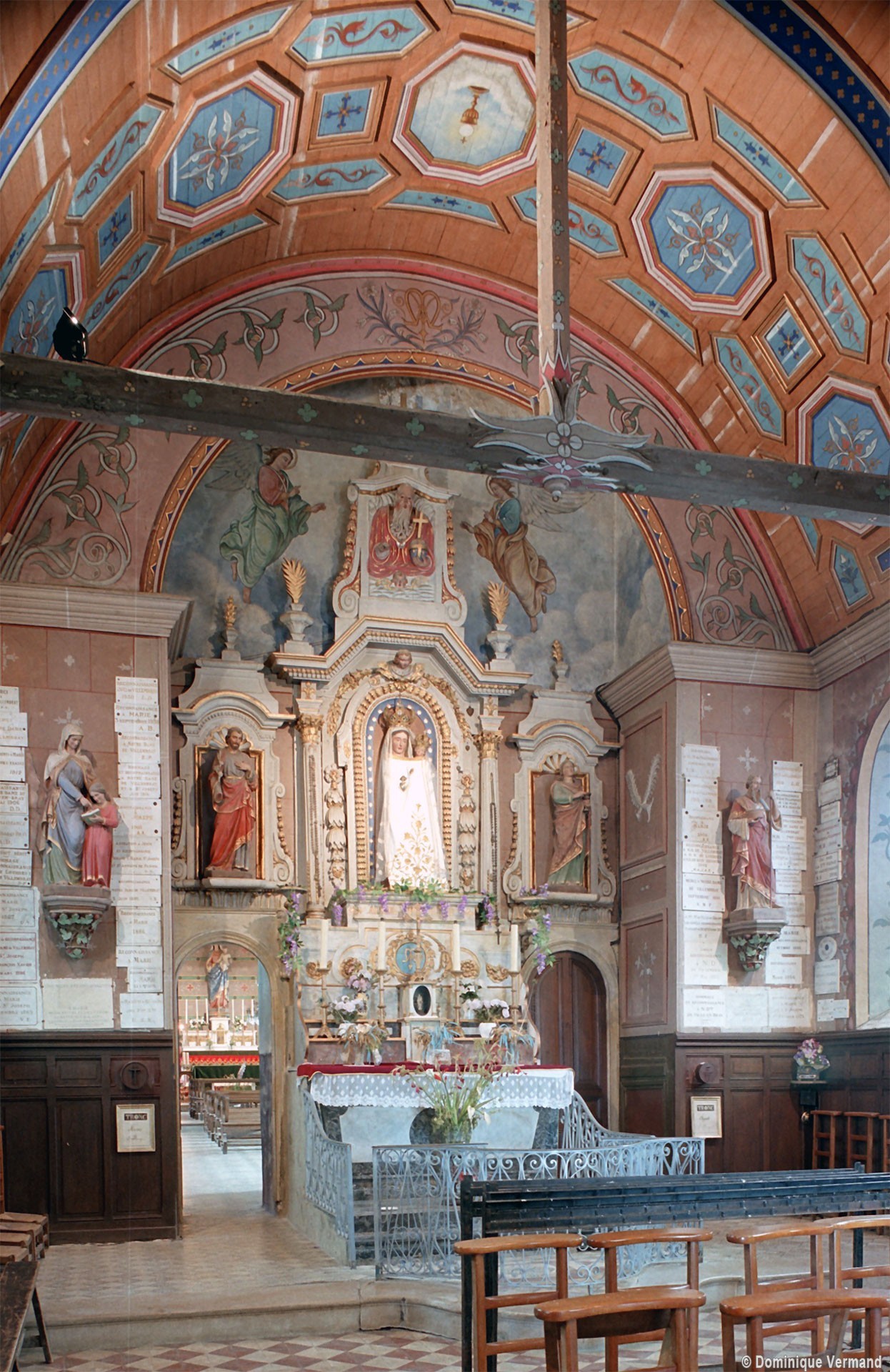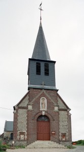 La moitié ouest de la nef et la chapelle qui la précède et abrite la statue de la Vierge miraculeuse, sont plus récentes, toujours d’après la charpente. Les apports du 19ème siècle sont en revanche facilement identifiables : clocher porche en briques et grès surmonté d’un beffroi en charpente couverte d’ardoises et chapelles orientales – dédiées au Sacré Coeur et à saint Joseph – construites en 1878 à l’initiative du curé, A.V. Heu.