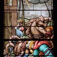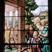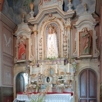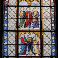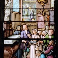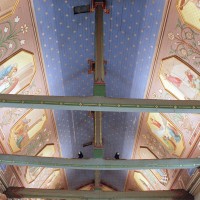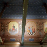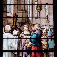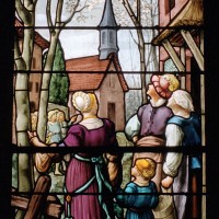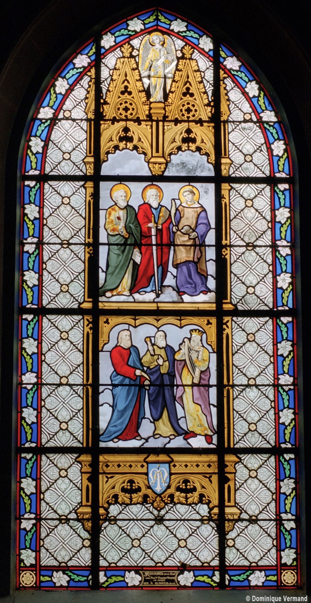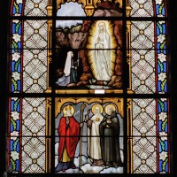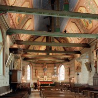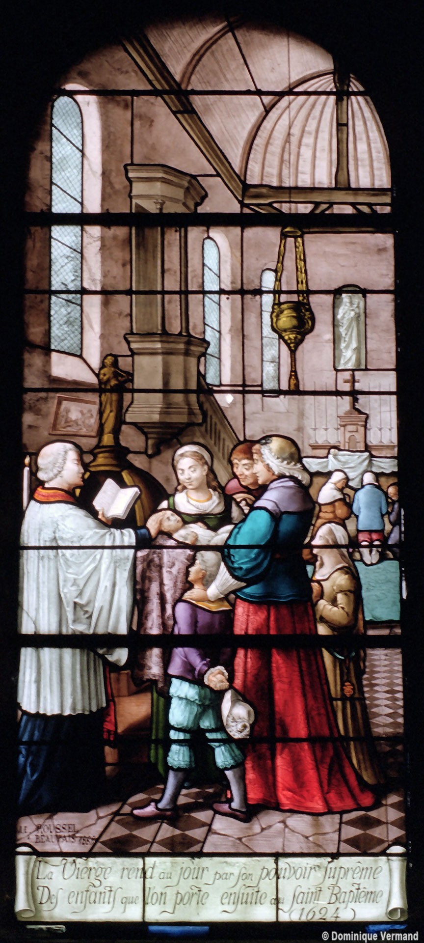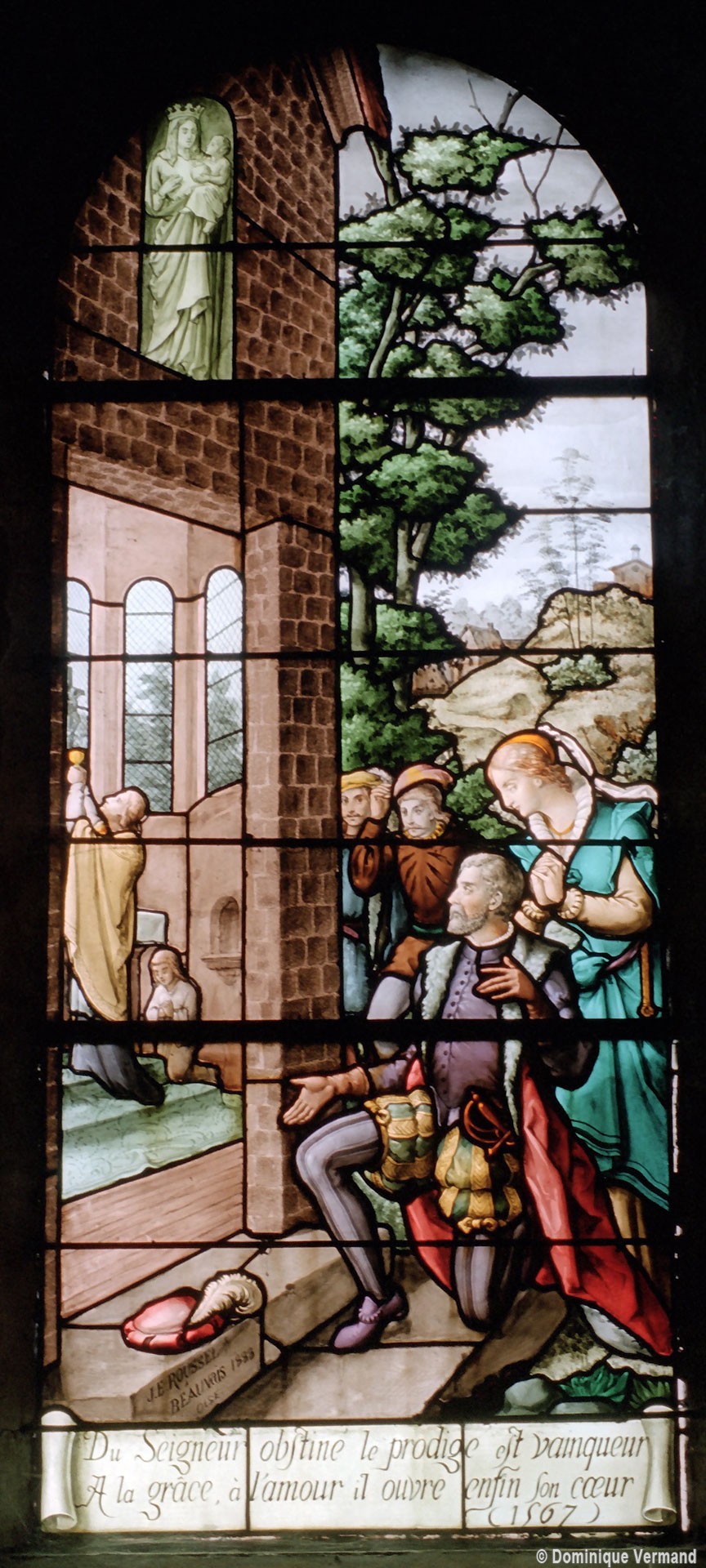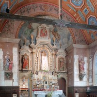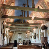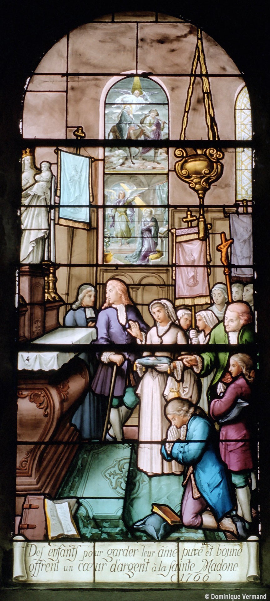 La moitié ouest de la nef et la chapelle qui la précède et abrite la statue de la Vierge miraculeuse, sont plus récentes, toujours d’après la charpente. Les apports du 19ème siècle sont en revanche facilement identifiables : clocher porche en briques et grès surmonté d’un beffroi en charpente couverte d’ardoises et chapelles orientales – dédiées au Sacré Coeur et à saint Joseph – construites en 1878 à l’initiative du curé, A.V. Heu.