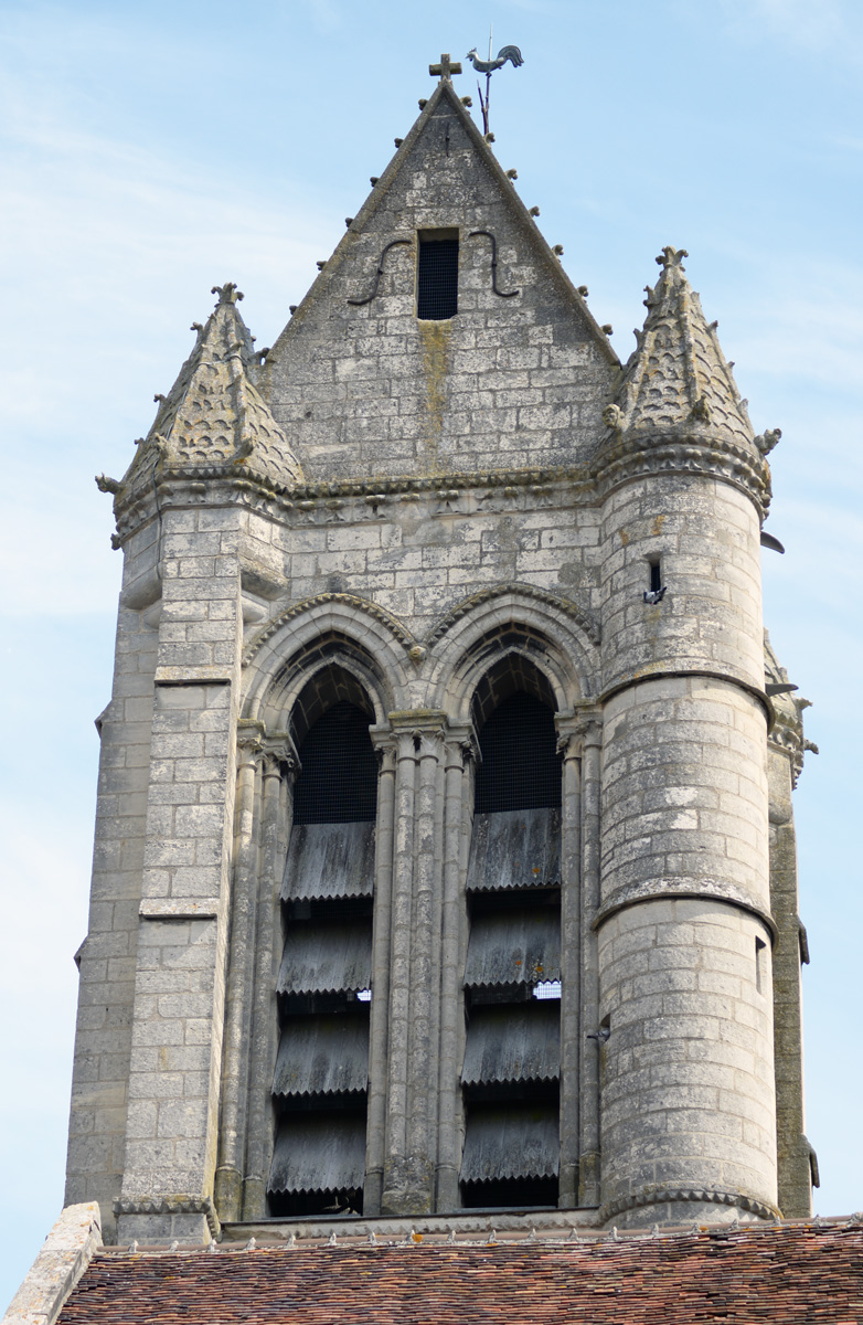 Campé à l’angle nord-est du chœur, le clocher attire l’attention par ses longues baies jumelles en tiers-point ouvertes sur chaque face et par son toit en bâtiere cantonné de clochetons d’angle à six pans garnis d’écailles, réminiscence des petites pyramides accompagnant les flèches romanes du Valois et du Vexin (1978, modifié 2015).