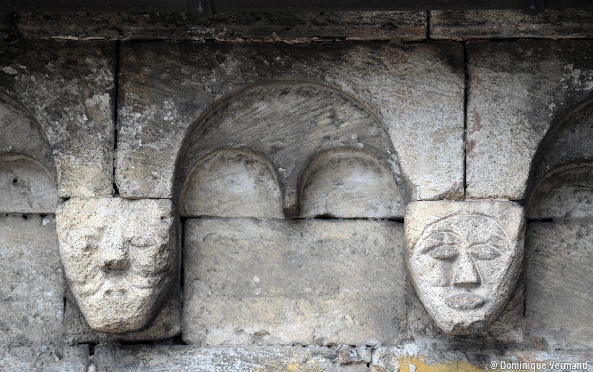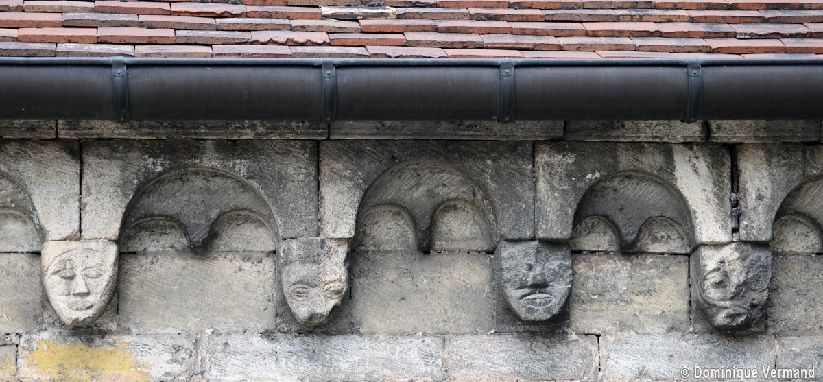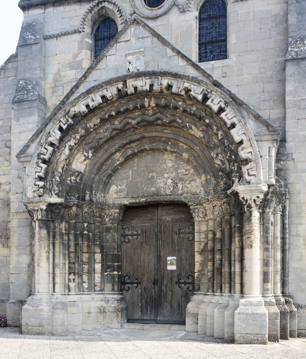 A la façade ouest, se remarque un profond portail à gâble, le plus achevé de ce type dans la région. Les nombreuses voussures en plein cintre s’ornent de bâtons brisés et d’une frette crénelée. Les murs des bas-côtés sont terminés par une corniche beauvaisine vigoureusement sculptée. Une autre corniche, au très original décor de petits personnages allongés, de têtes grimaçantes, d’animaux fantastiques, faisant curieusement songer à l’art africain et vraisemblablement d’origine celtique, couronne les murs de la nef.