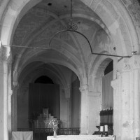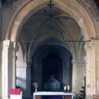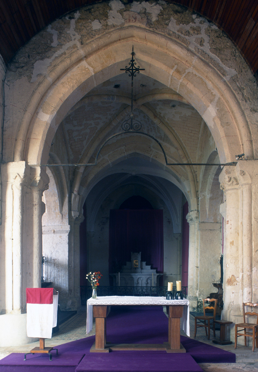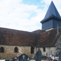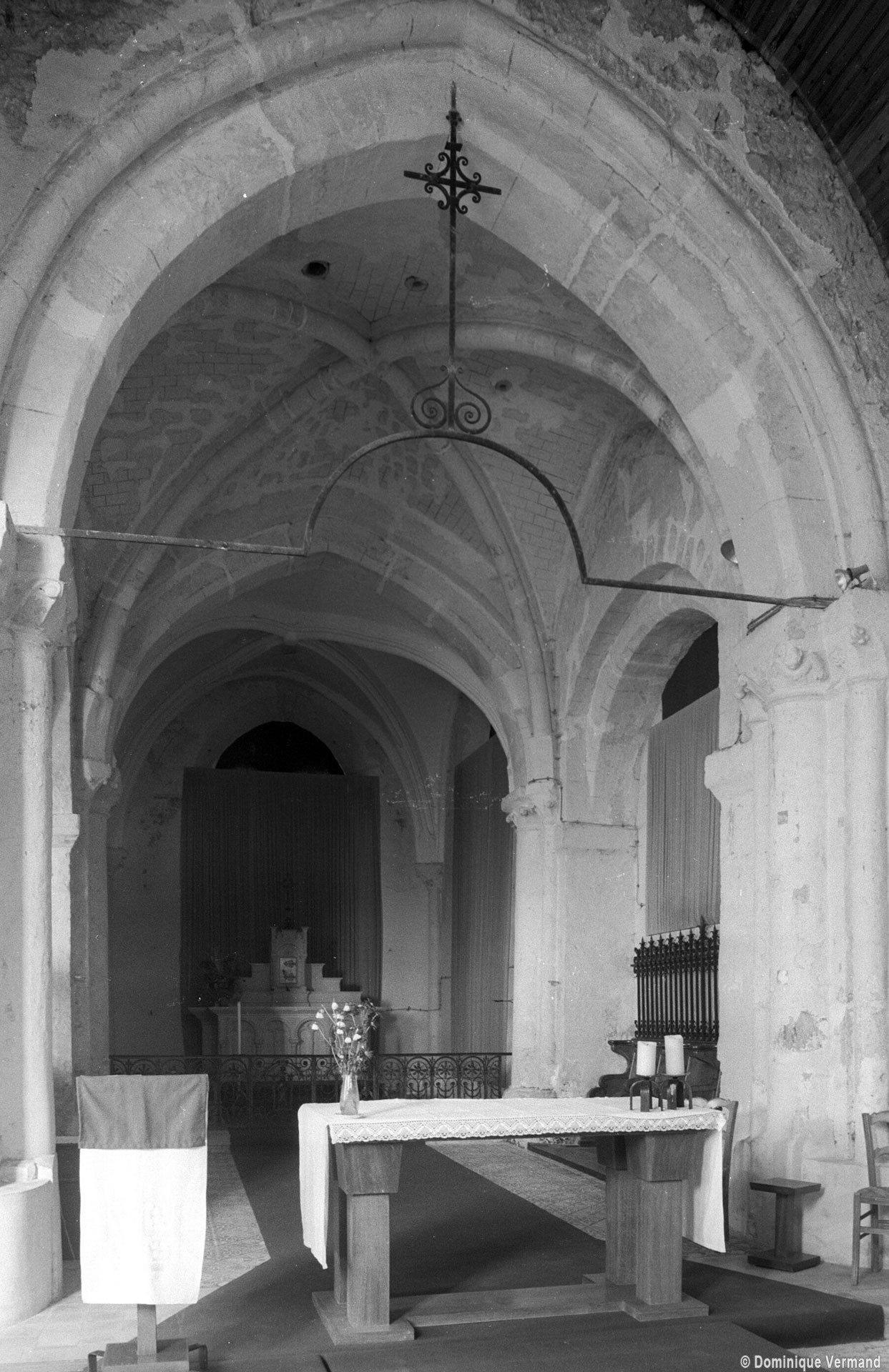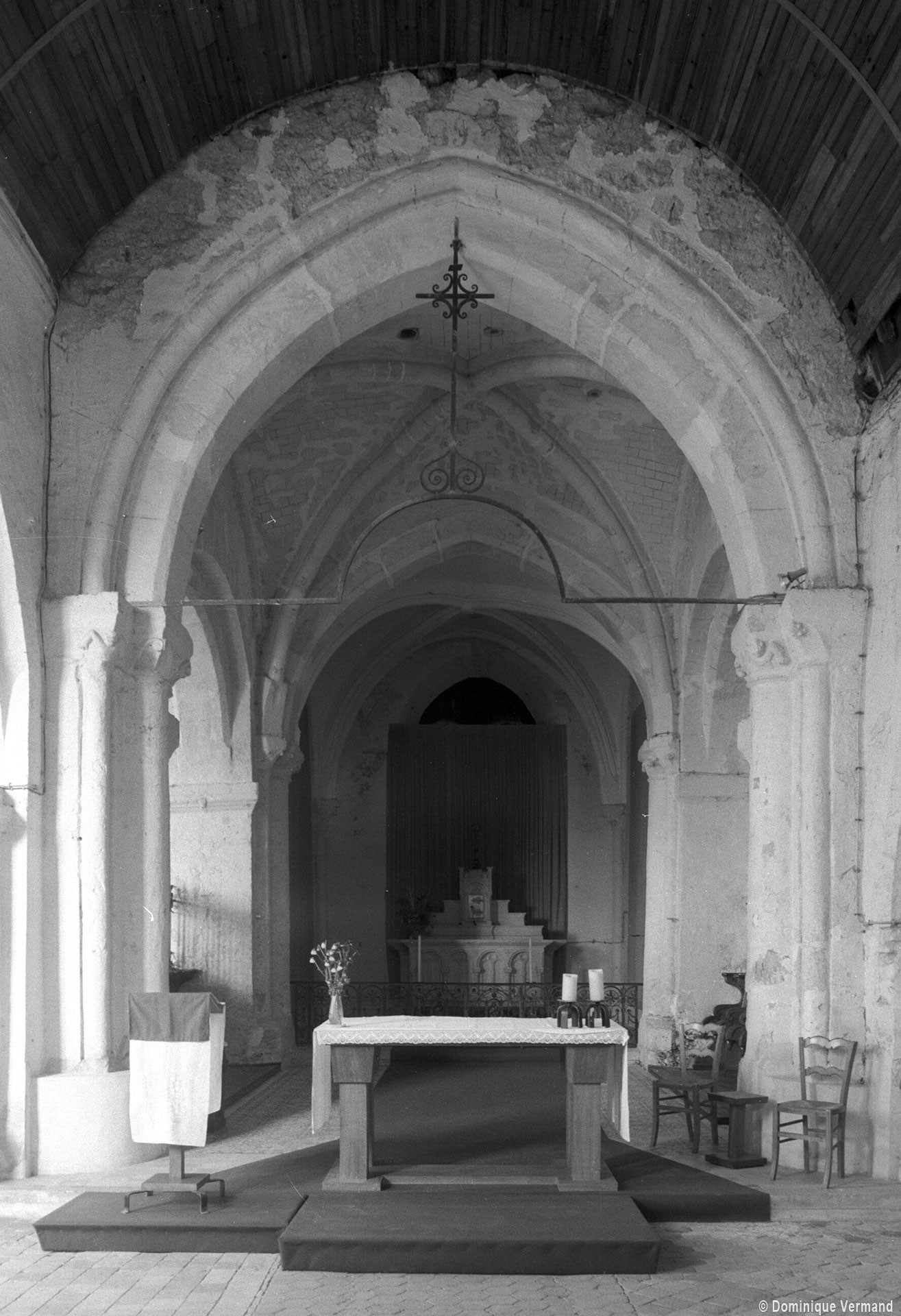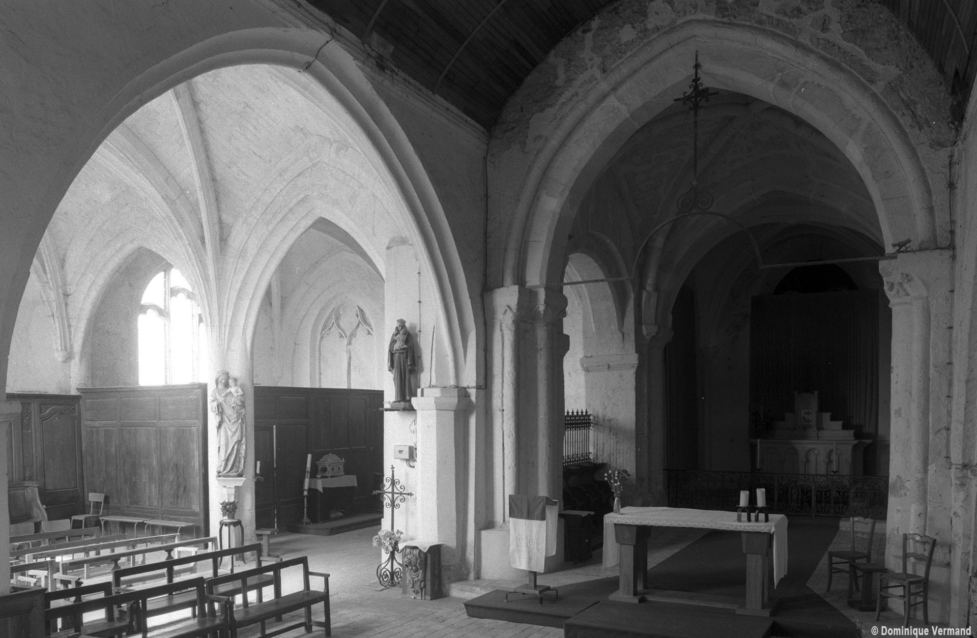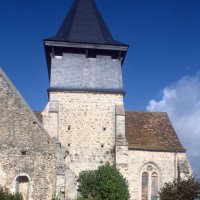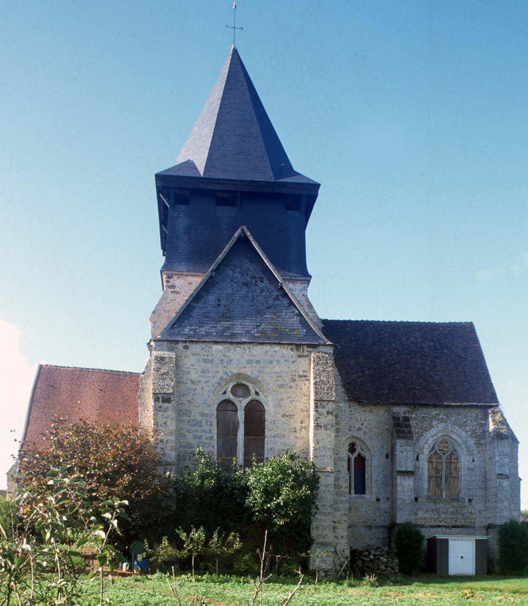 Le choeur de deux travées à chevet plat a été construit durant la première moitié du 13ème siècle, sans doute en réutilisant une base plus ancienne comme semblent le montrer les deux arcades en plein cintre s’ouvrant de chaque côté de la première travée et, au nord, un tailloir décoré de petits masques qui rappellent ceux du Fay-Saint-Quentin (début 12ème siècle), près de Bresles. Les ogives des deux voûtes – qui n’ont pas le même profil – retombent sur des chapiteaux à crochets d’une facture inhabituelle et assez fruste. Du clocher qui s’élevait sur la première travée ne subsiste que le soubassement, couronné d’un ouvrage en charpente couvert d’ardoises qui existait déjà au 18ème siècle.