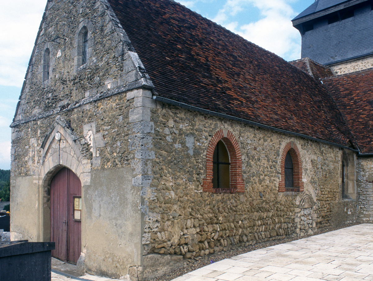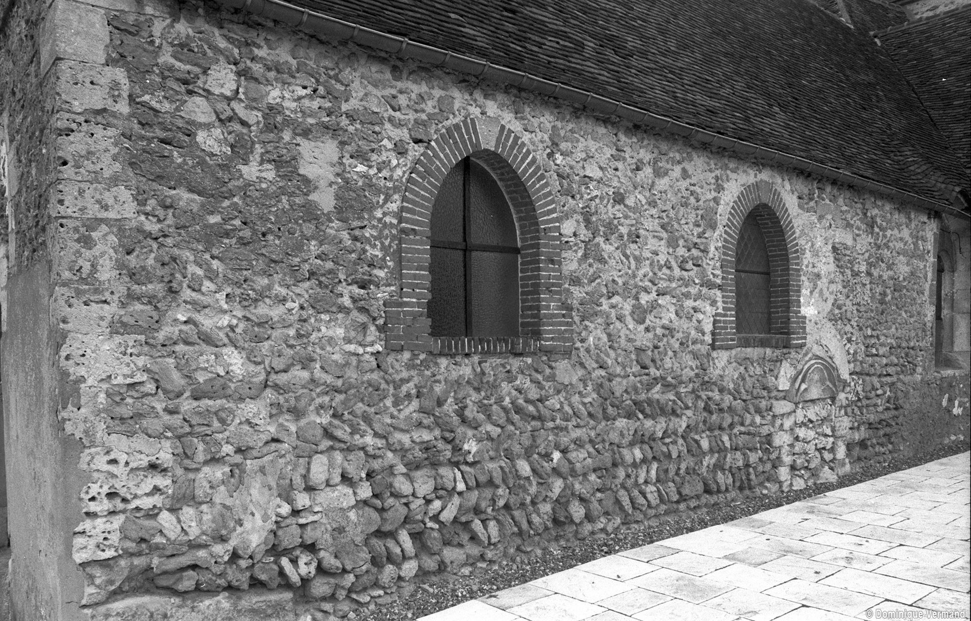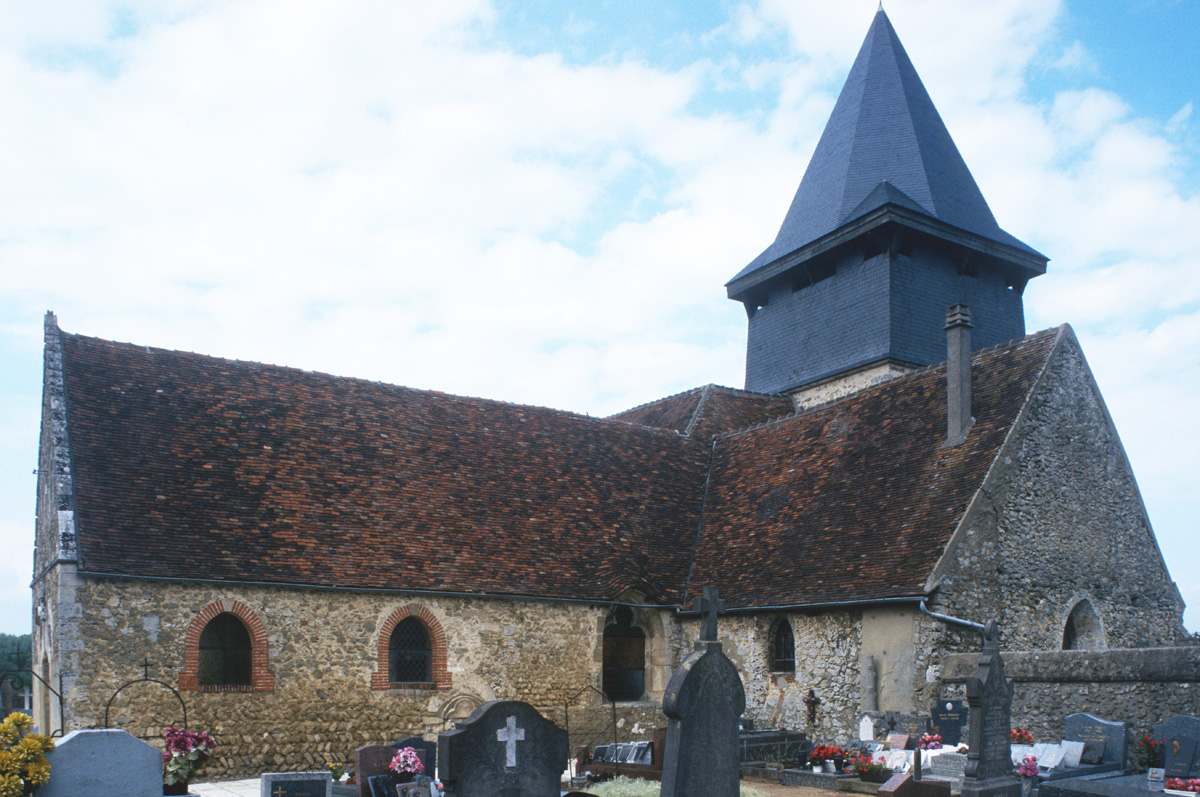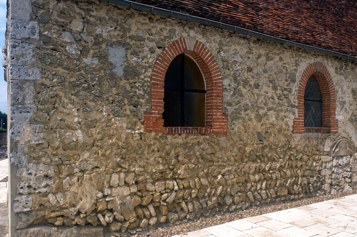 Saint-Martin s’élève sur un replat du versant méridional de la vallée du Thérain. C’est un édifice très hétérogène, construit dans un calcaire très coquillier, dont la partie la plus ancienne est la nef unique, du 11ème siècle. Bien que remaniée par la suite (pignon, ouvertures), elle est intéressante pour son bel appareil en “opus spicatum” et les trois petites fenêtres d’origine – aujourd’hui bouchées – qu’elle conserve. Leur étroitesse a dispensé d’appareiller un cintre qu’on s’est contenté de simuler dans une pierre, avec des claveaux figurés par des traits gravés. C’est une manière de faire que l’on retrouve dans nombre de petites églises rurales à cette époque. Toujours pour des raisons de d’économie, il n’y a pas de contreforts, les angles de la construction étant simplement renforcés par des pierres appareillées en carreaux et boutisses.