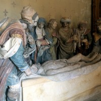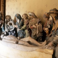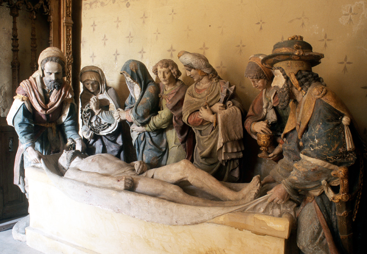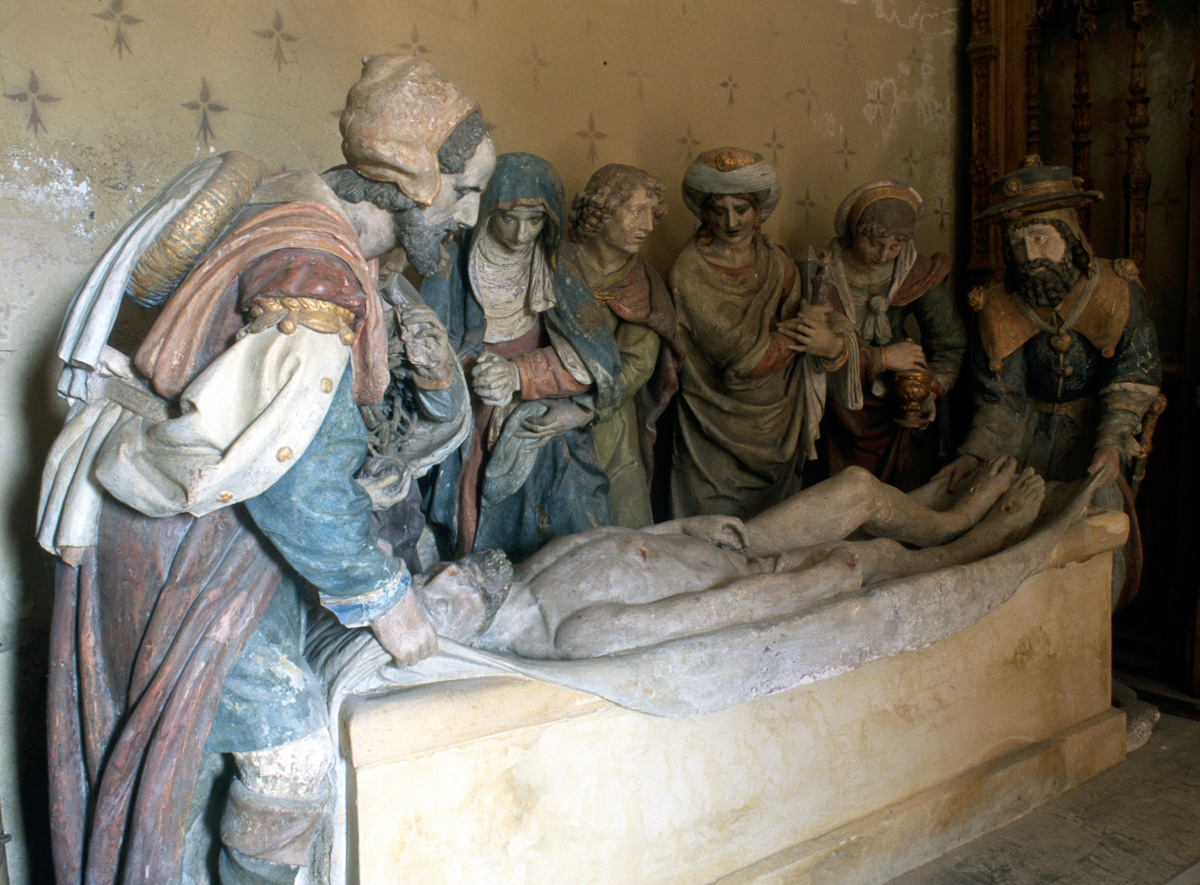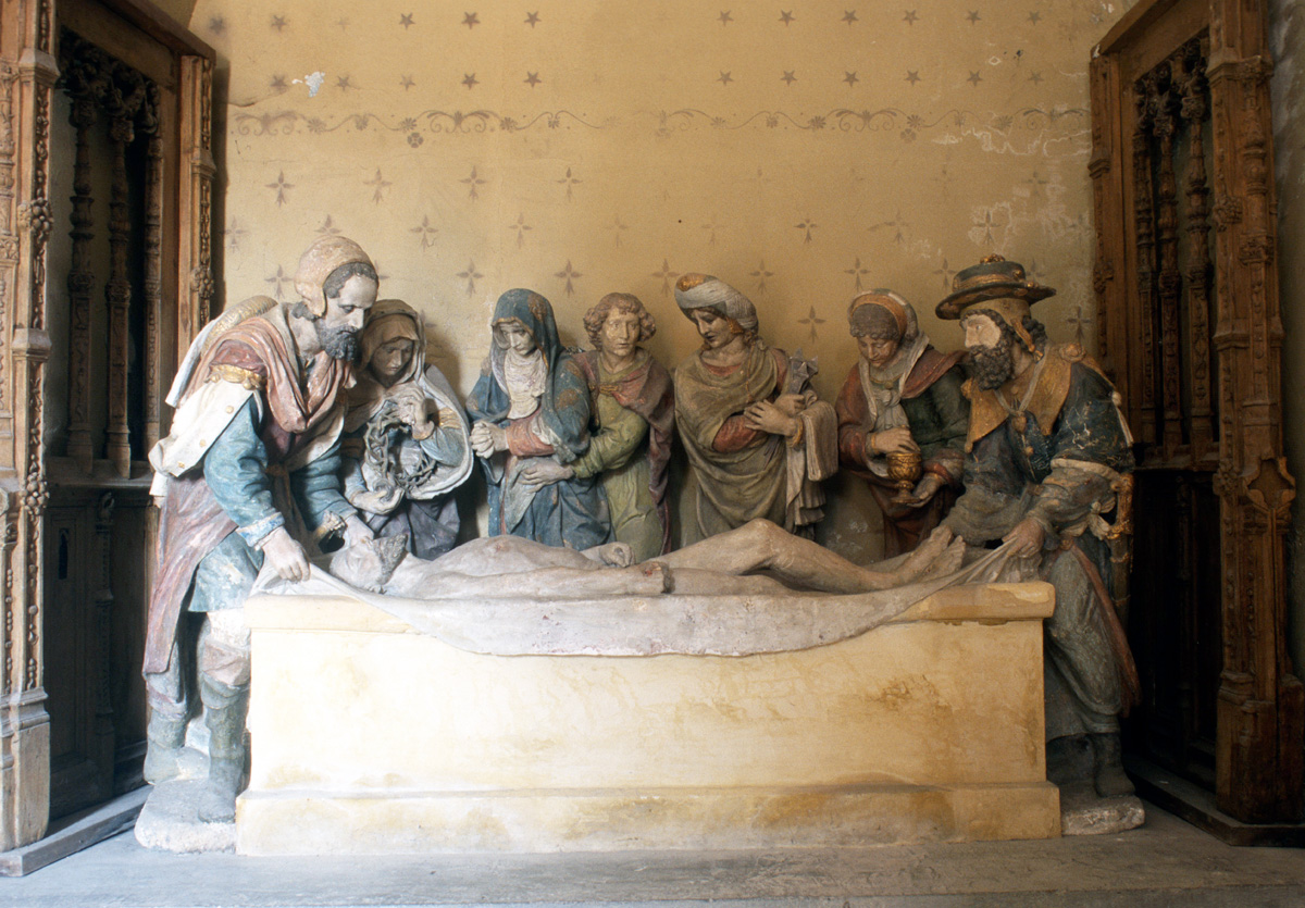 C’est au début du 15ème siècle qu’il faut attribuer la chapelle sans style qui s’ouvre au sud de la nef si l’on se réfère aux très intéressantes fresques qui y ont été découvertes en 2002. Elle abrite la belle Mise au Tombeau (1622) qui se trouvait autrefois dans la toute proche église prieurale, détruite à la Révolution. Les personnages sont représentés grandeur nature et ont gardé leur polychromie. Joseph d’Arimathie, à gauche, et Nicodème déposent le corps du Christ dans le tombeau. Entre eux se tiennent la Vierge, que soutient saint Jean, et trois saintes femmes, dont Marie-Madeleine tenant un vase d’aromates.