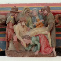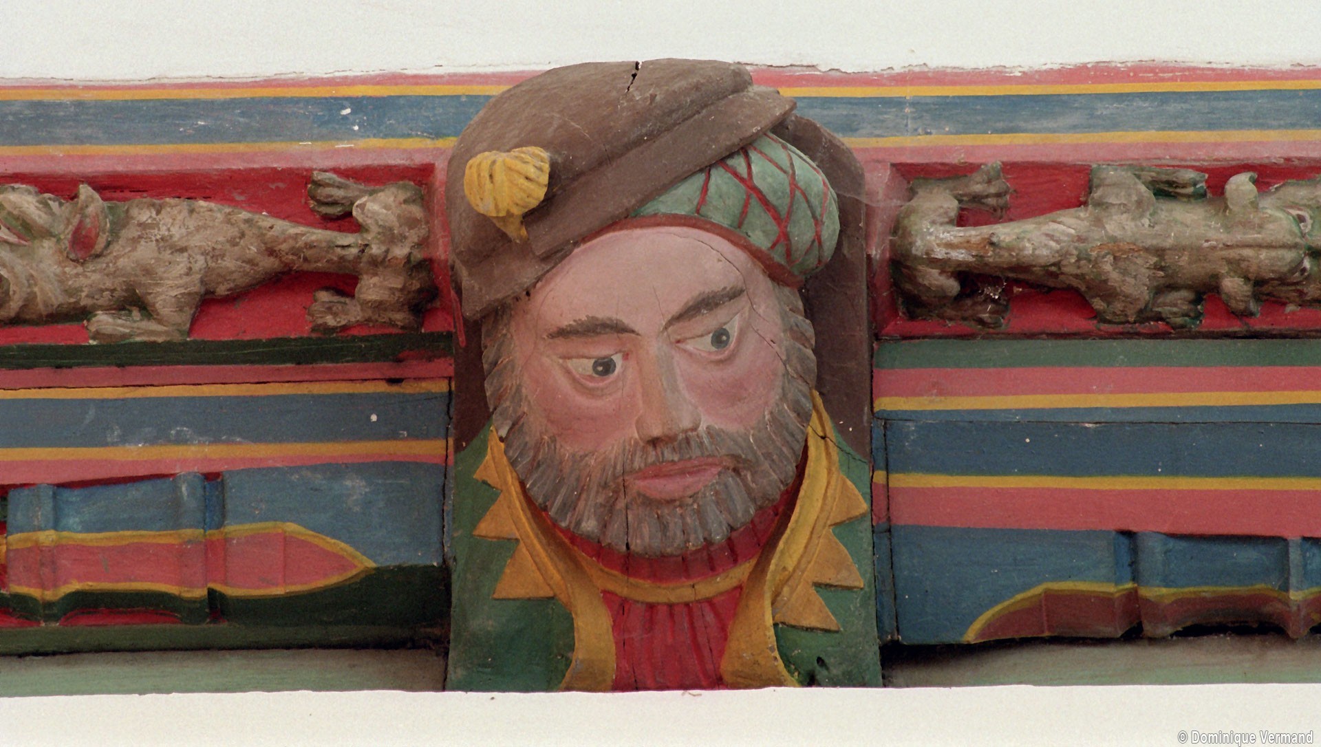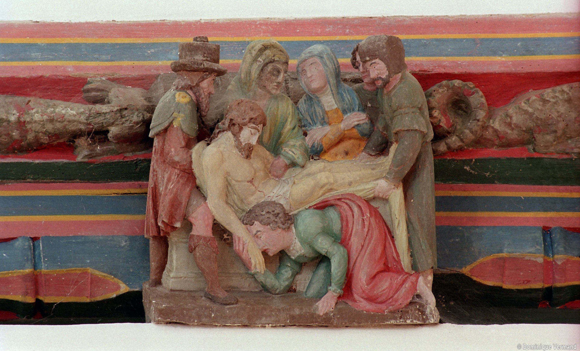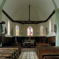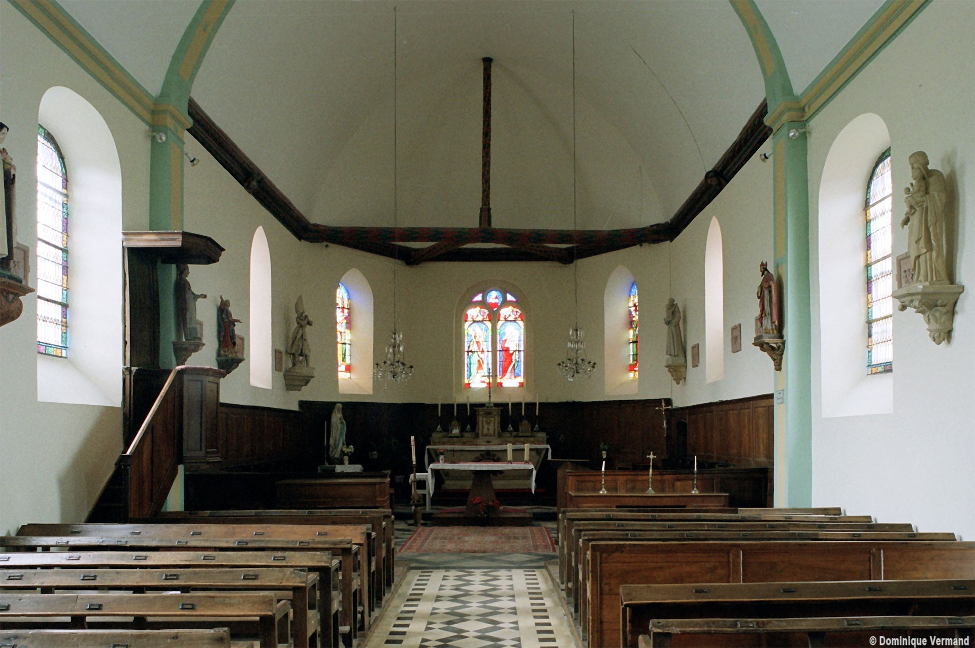 Partie la plus ancienne, le choeur remonte au 16ème siècle comme le prouve la fenêtre à meneau percée dans l’axe et qui, avec ses formes en plein cintre, est déjà de la Renaissance. Les quatre autres fenêtres ne sont en revanche que de simples lancettes, nouvel exemple de l’accent mis sur la fenêtre axiale. Cette datation est confirmée par la charpente en carène, dont les sablières décorées d’animaux fantastiques comportent deux blochets représentant, l’un une tête d’homme barbu très réaliste, l’autre une touchante Déposition de Croix traitée avec beaucoup de finesse.