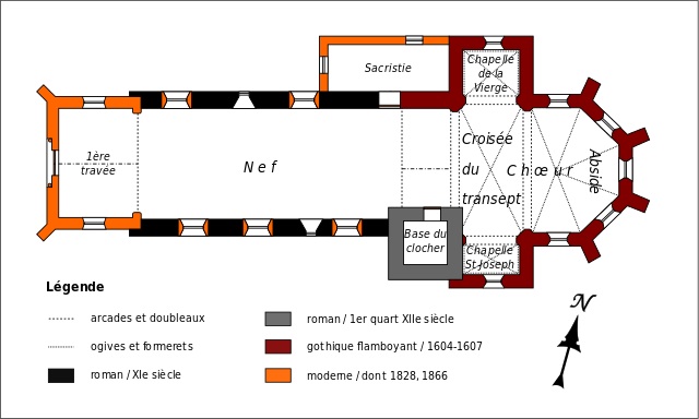 La sacristie est de 1828 et le porche néo-roman de 1866. Un vitrail de 1604 représentant notamment une Crucifixion est conservé dans le choeur (1998).