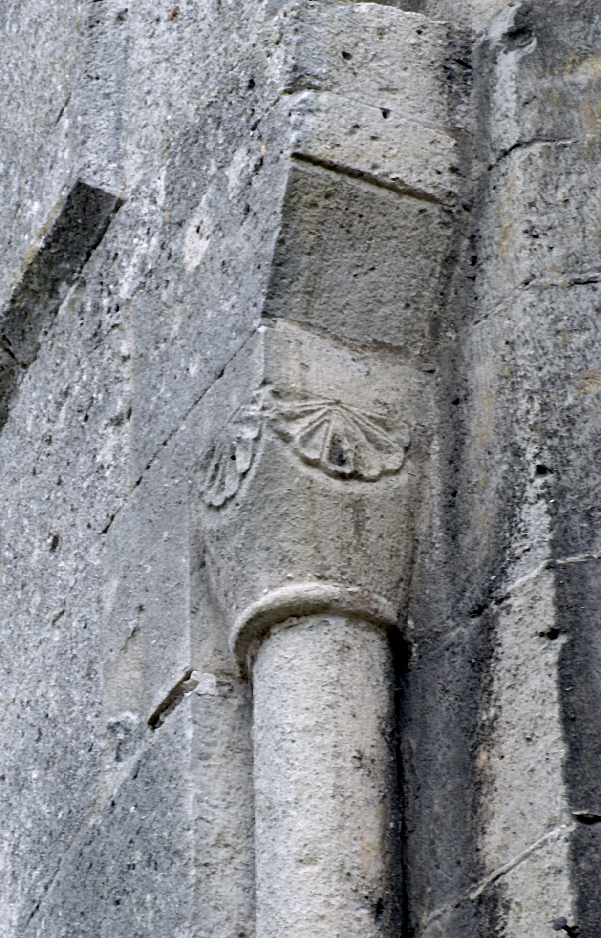 Détail d'une baie du clocher, avec un chapiteau cubique (2002)