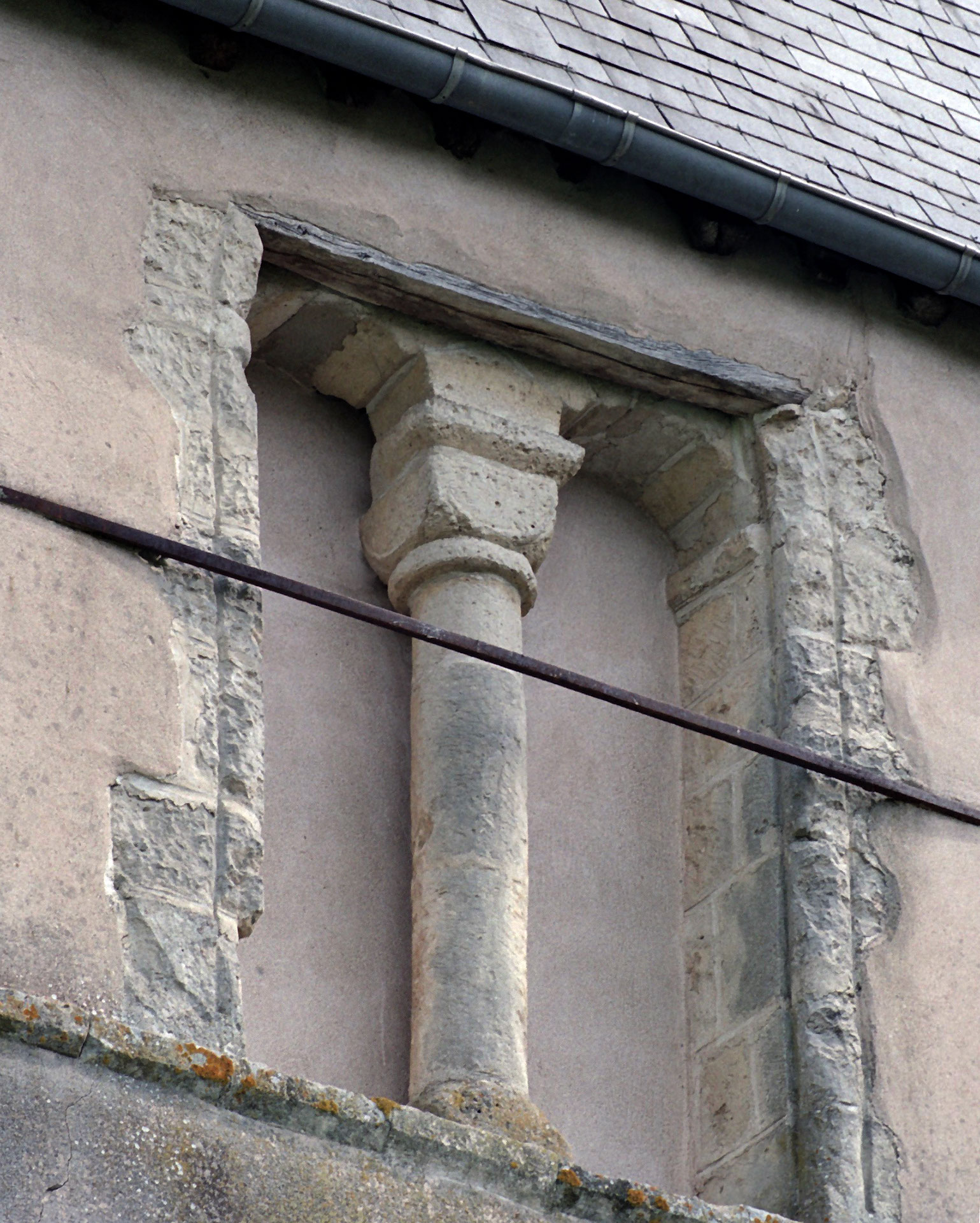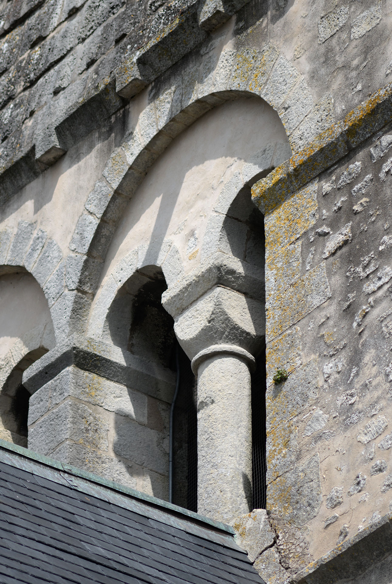 Détails d'une baie de la face est du clocher, avec la présence d'un chapiteau cubique (2016)