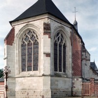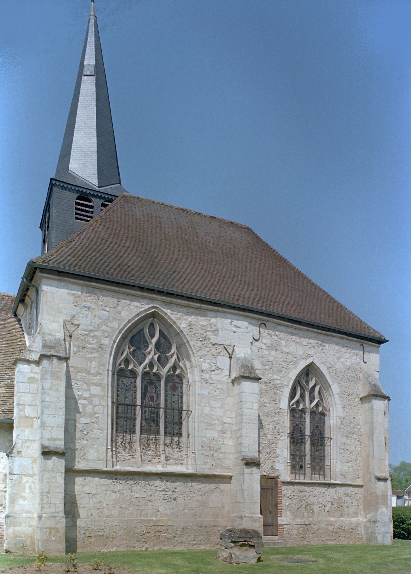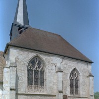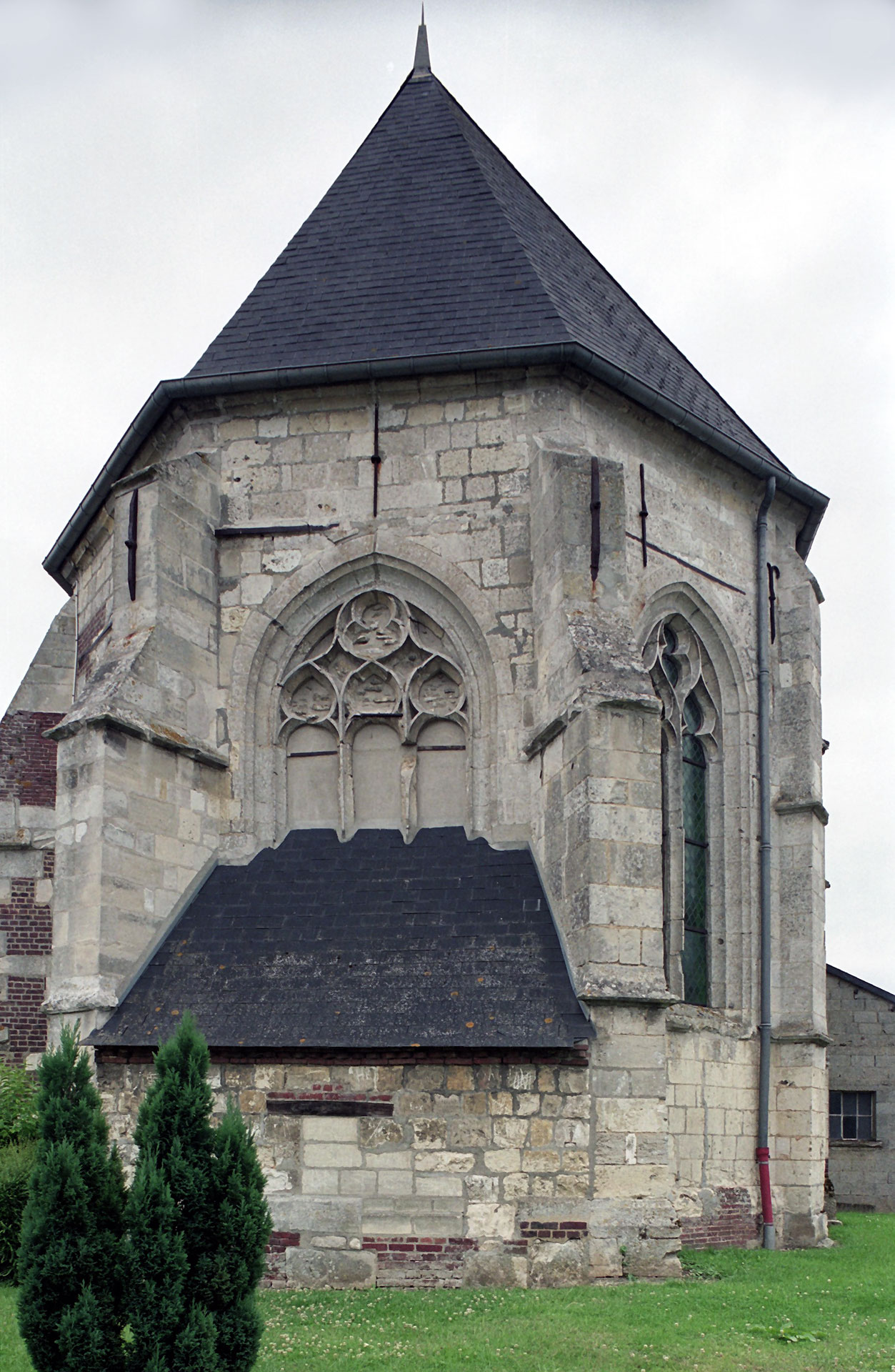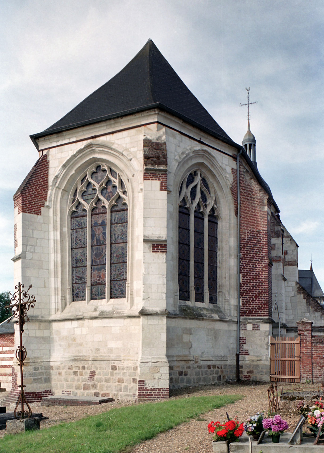 Le chevet de l'église, avec la trace, de part et d'autre de l'actuelle fenêtre, de deux des fenêtres du triplet primitif (2015)