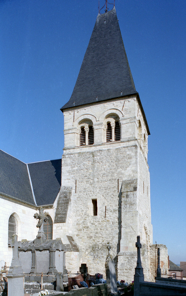 Le clocher vu du sud-ouest au début du 20ème siècle, avant son écroulement (photo Eugène Lefèvre-Pontalis, Arch. Phot. Paris / S.P.A.D.E.M.)
